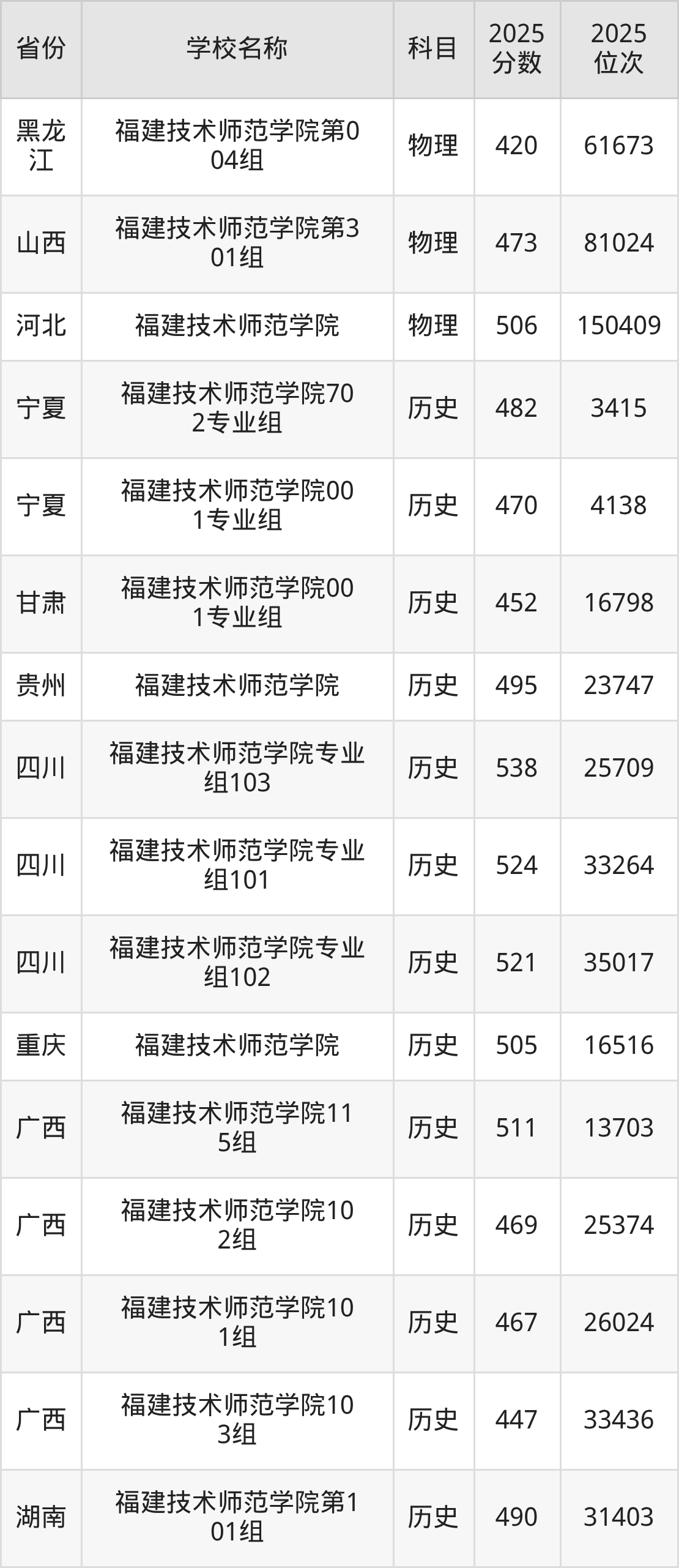 2025年福建技术师范学院在全国各省本科的最低录取分数线在353~538分之间。河北物理类高考生最低506分能上福建技术师范学院、福建物理类高考生最低504分能上福建技术师范学院……下文将展示福建技术师范学院在全国16个高考省份中的本科最低投档录取分汇总!