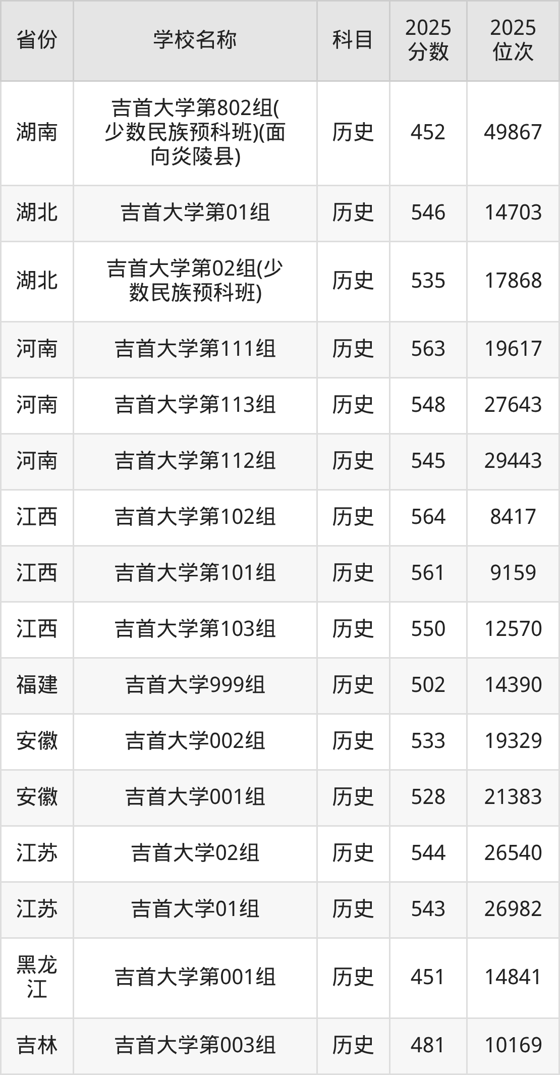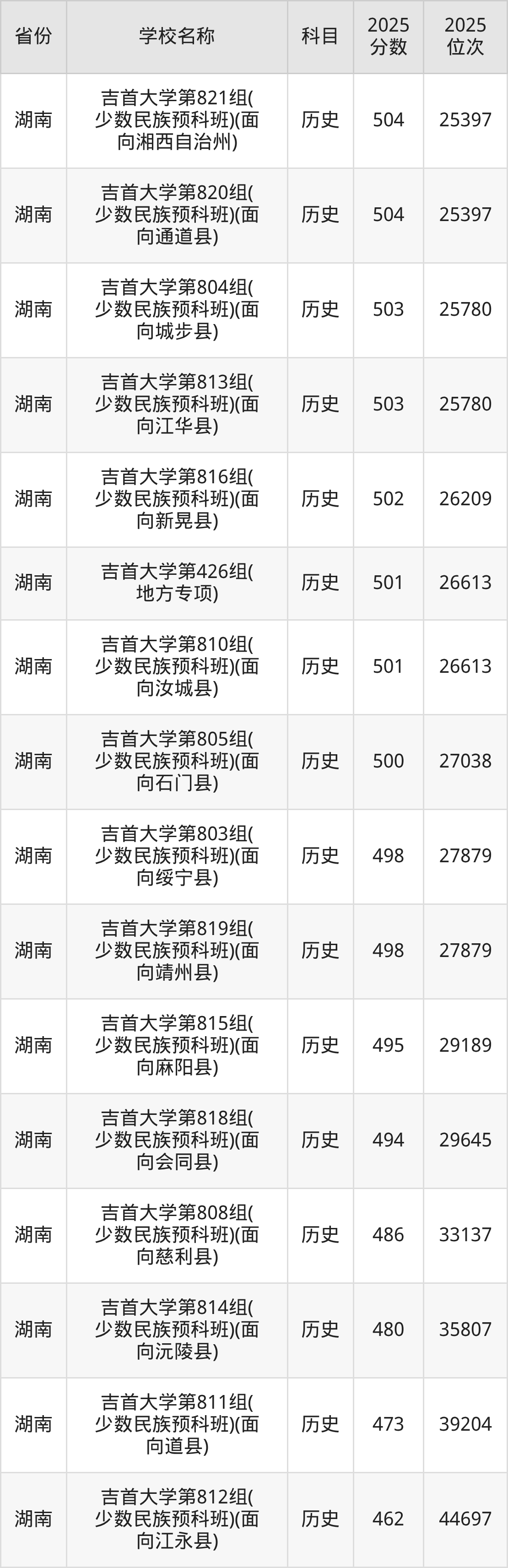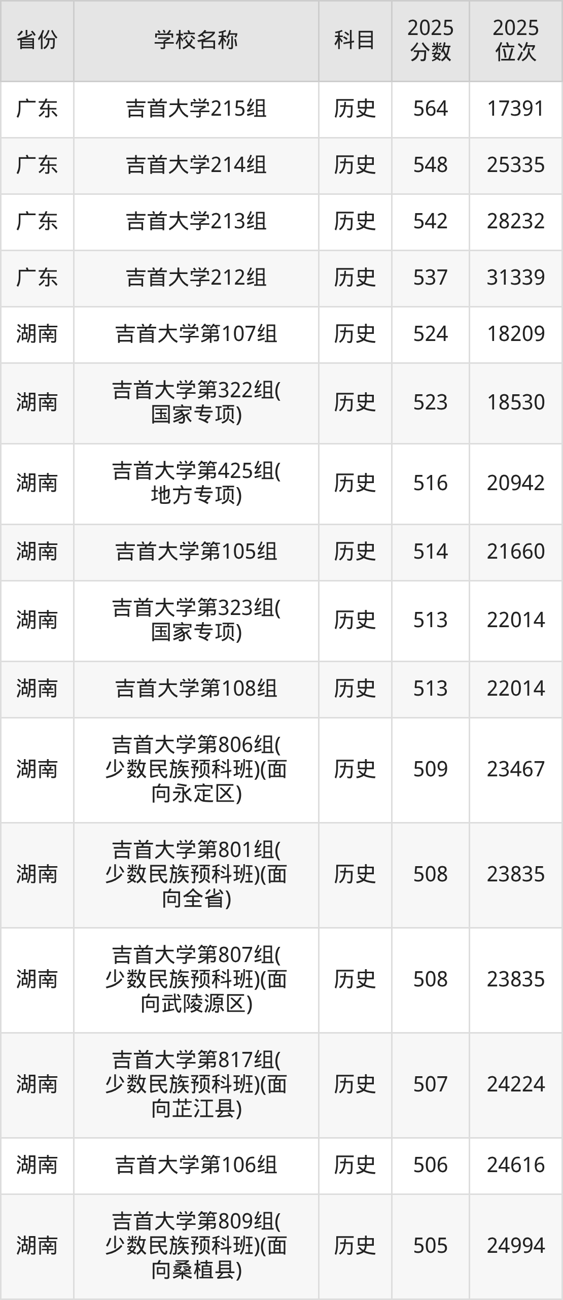 吉首大学2025年有29个专业组面向湖南省内首选了历史科目的考生招生: