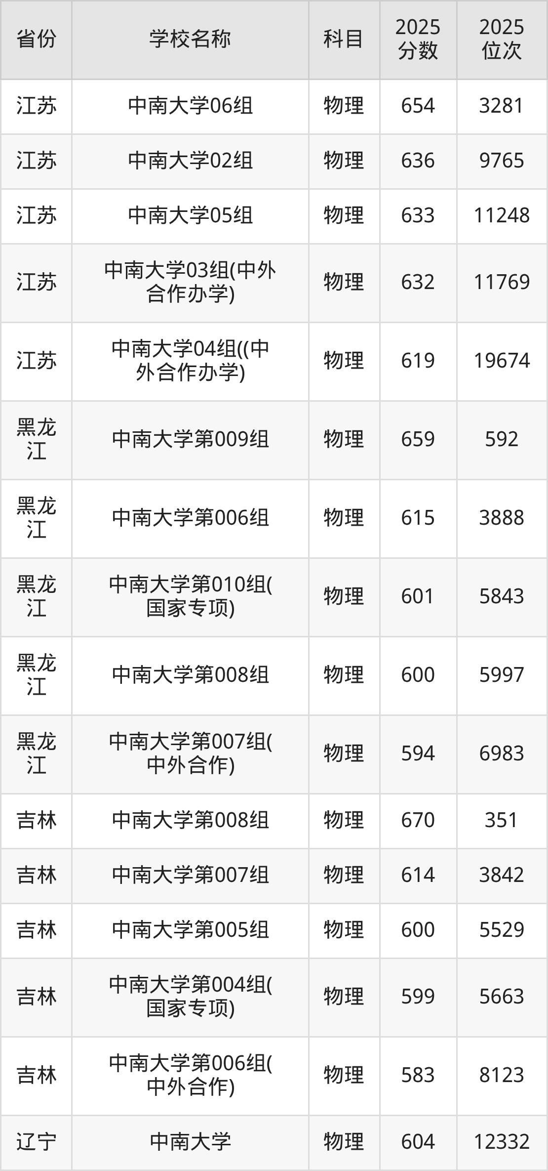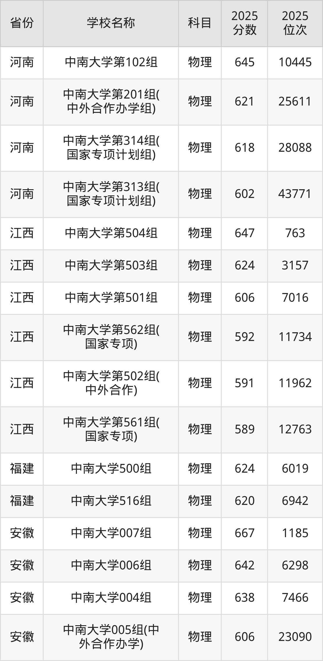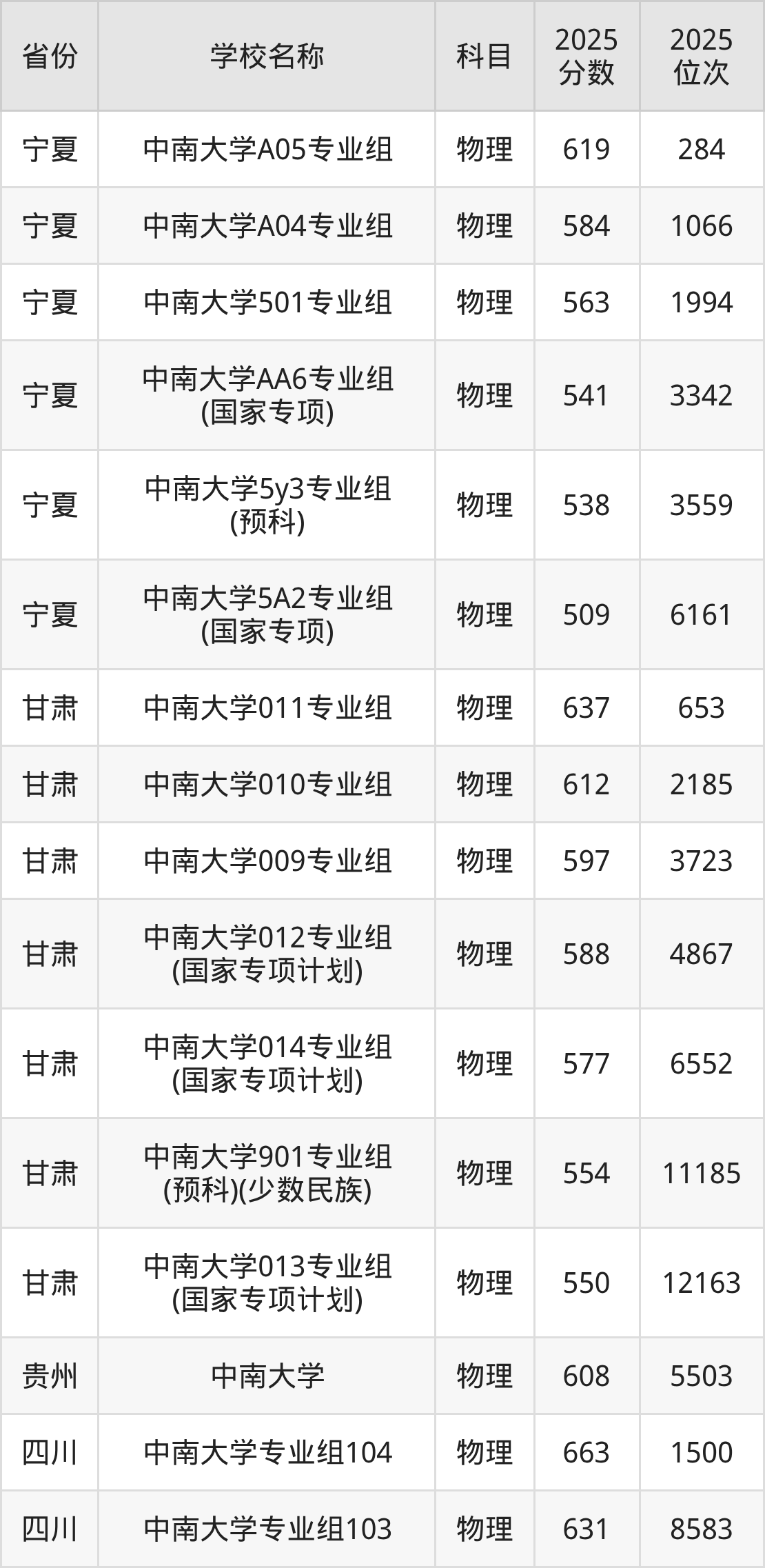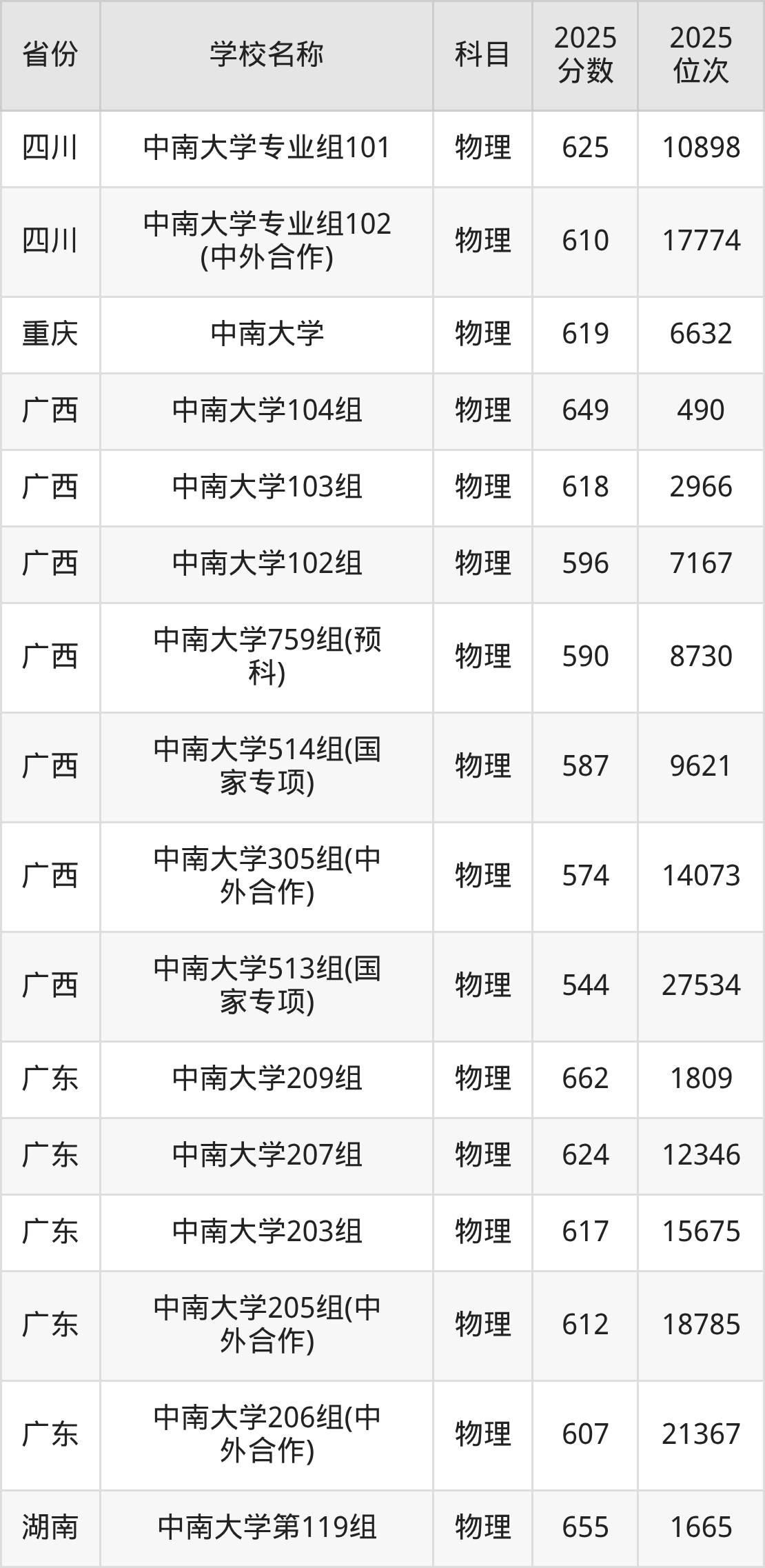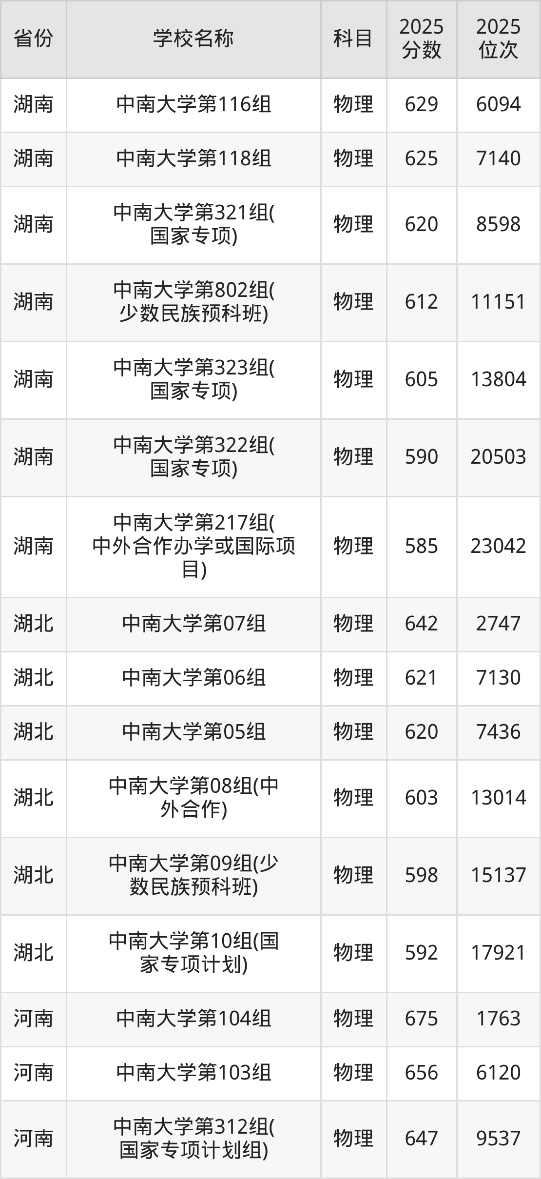 中南大学2025年有8个专业组面向湖南省内首选了物理科目的考生招生: