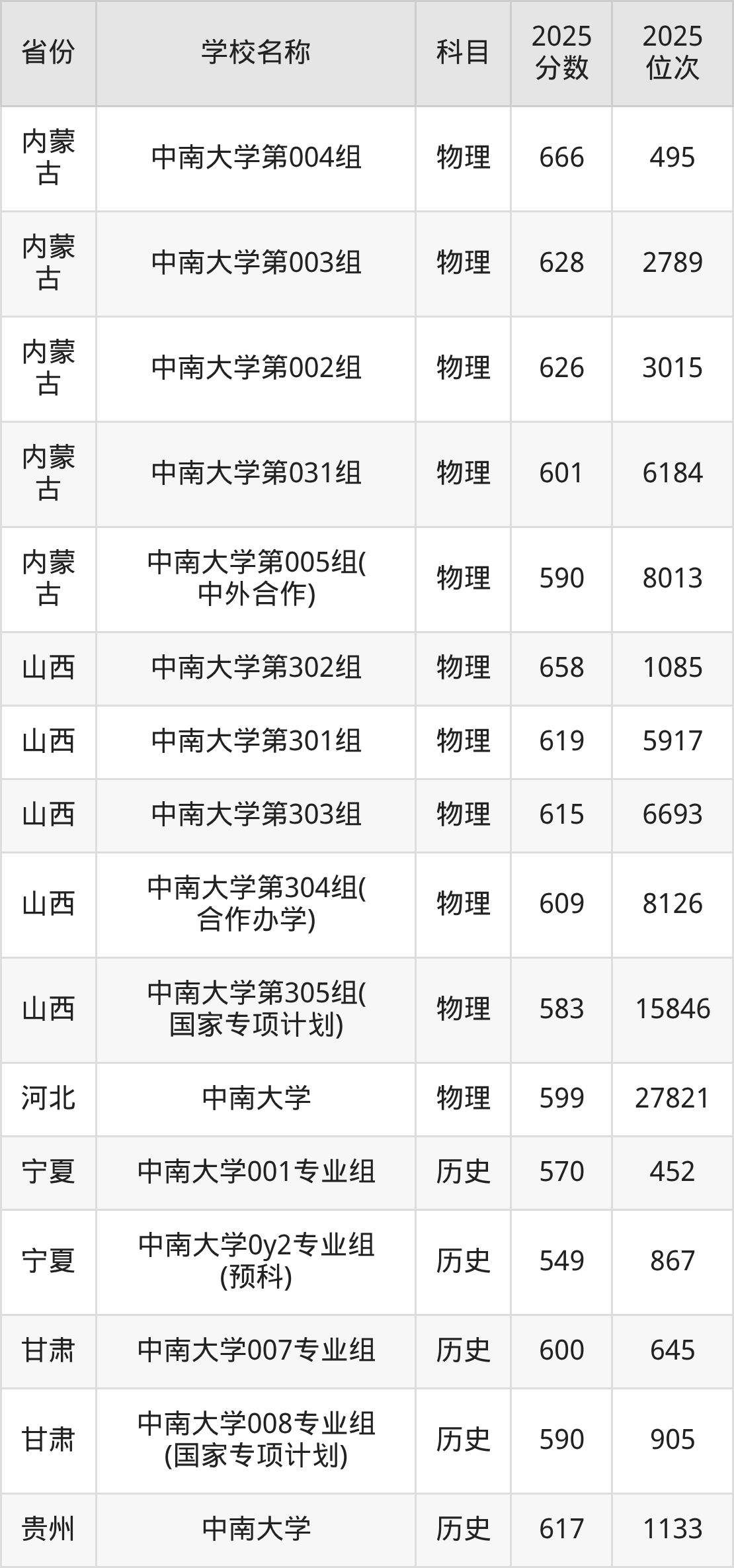 再看湖南高考2025年特招批次线,历史类是503分、物理类是476分。通过对比发现:中南大学2025年历史类最低分比特招线高100分,物理类最低分比特招线高109分。2026届湖南高考生,可通过每一次模考划线,来判断自己的成绩是否有机会被中南大学录取。