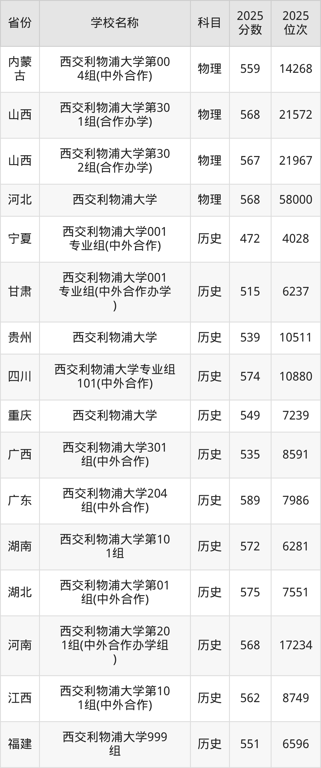 可见,西交利物浦大学的不同专业组,在“招生专业、录取分数线”等方面有较大区别。物理类专业组之间的分数线差距高达1分、历史类专业组之间的分数线差距高达19分。