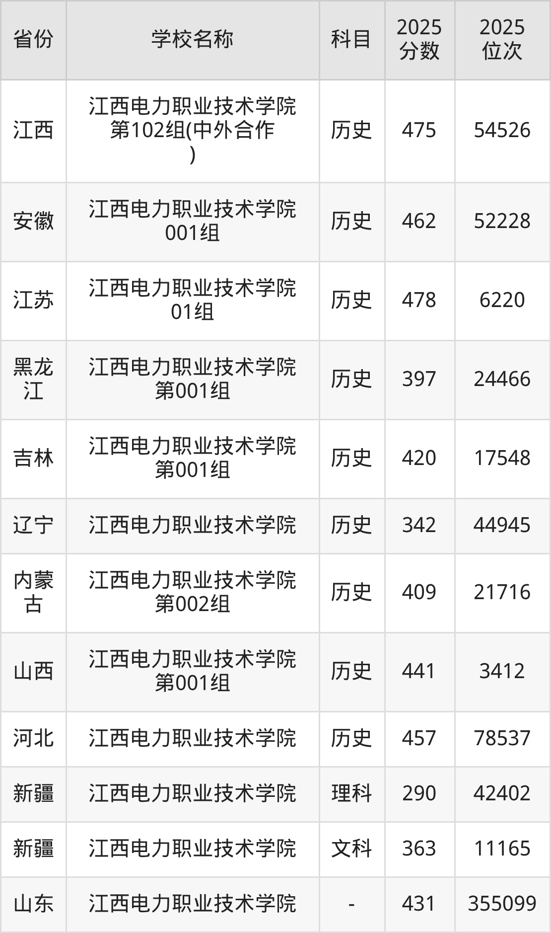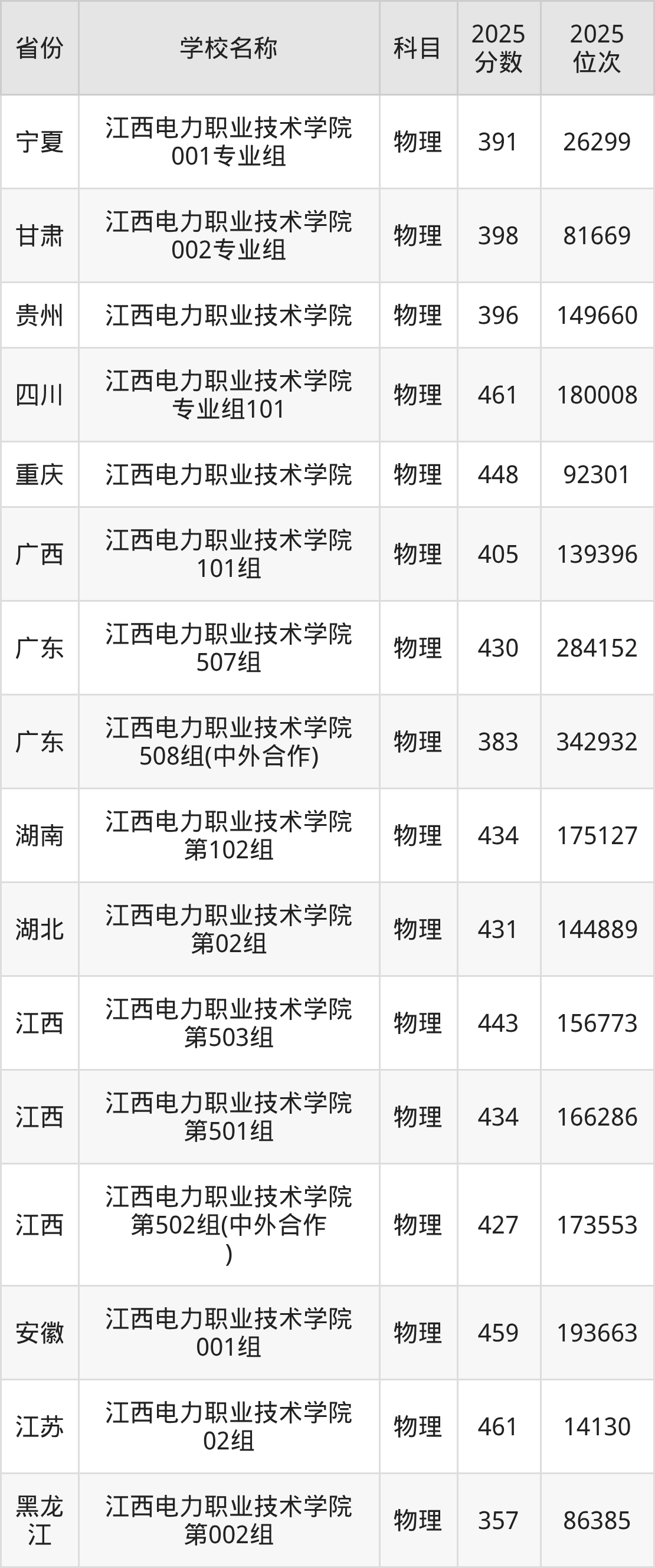 二、江西电力职业技术学院各专业录取分数线