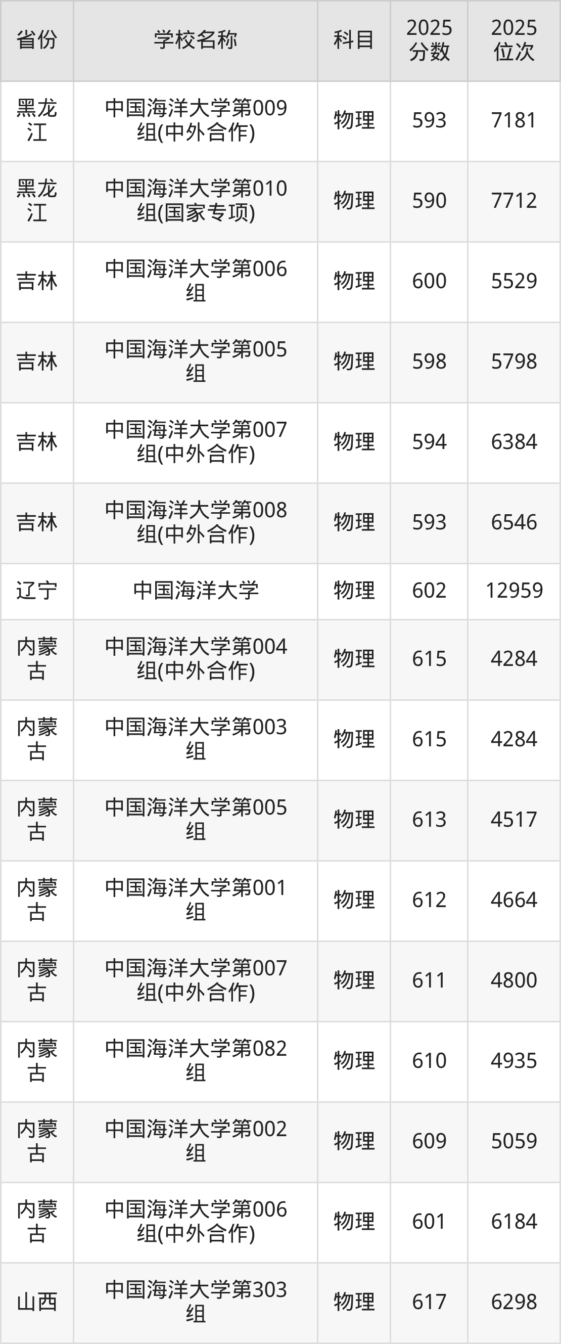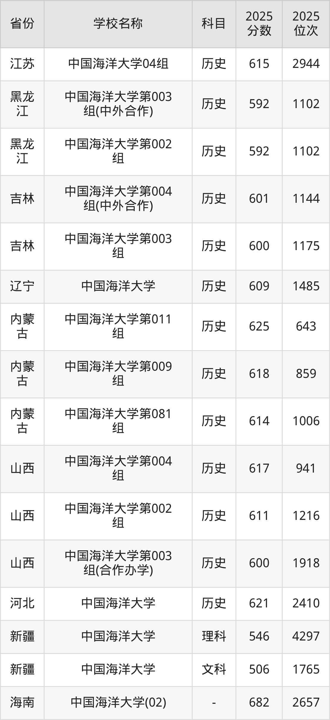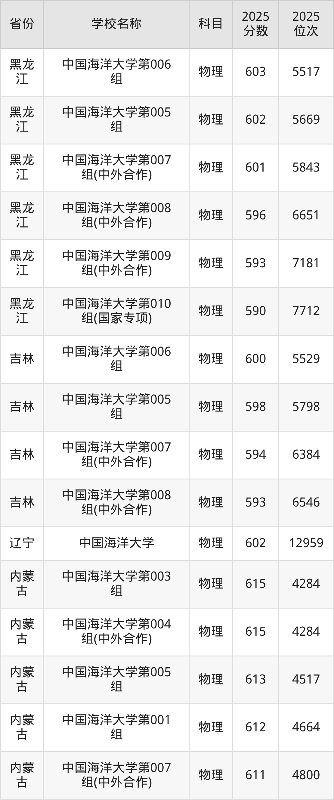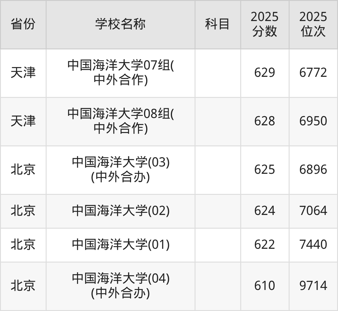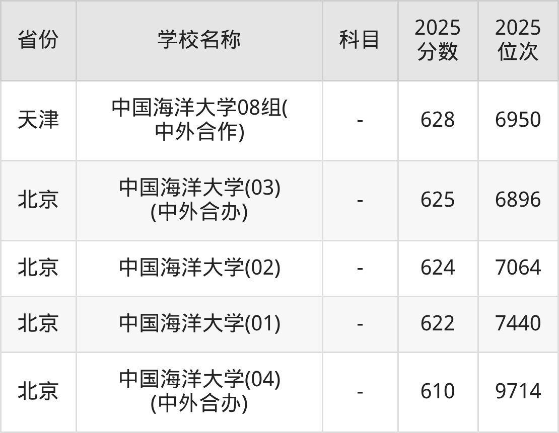 一、2025中国海洋大学录取分数线