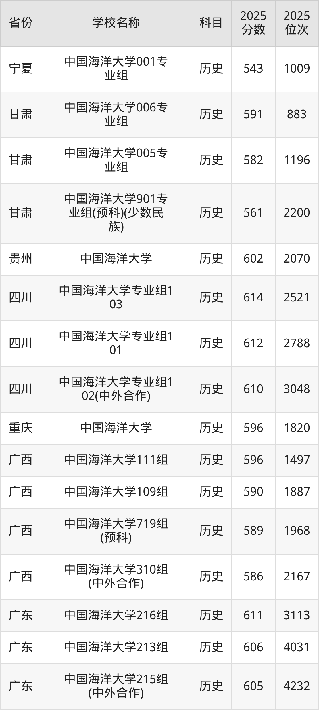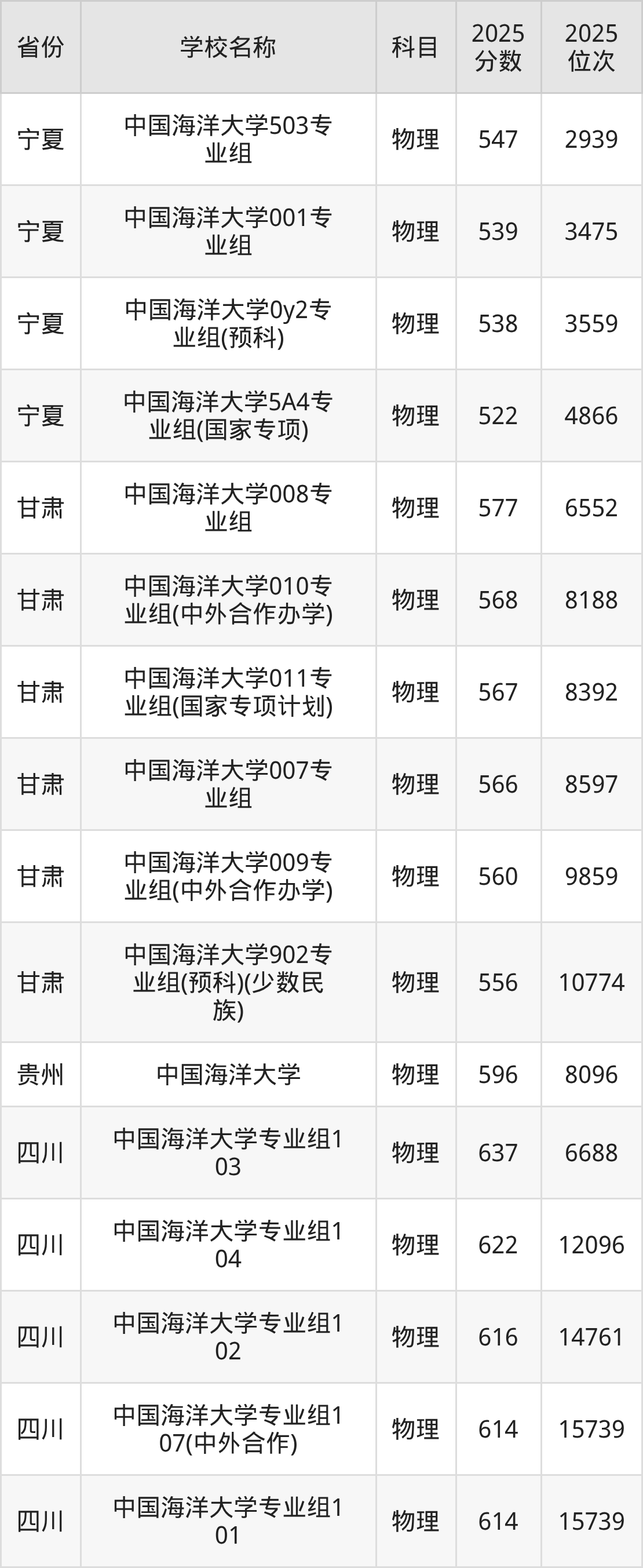 二、中国海洋大学各专业录取分数线