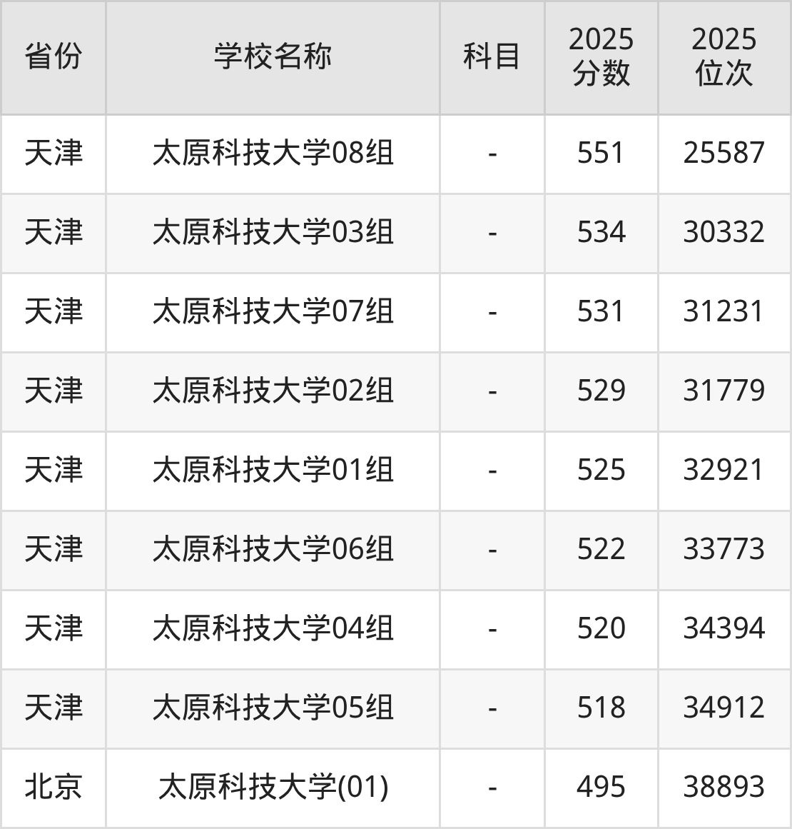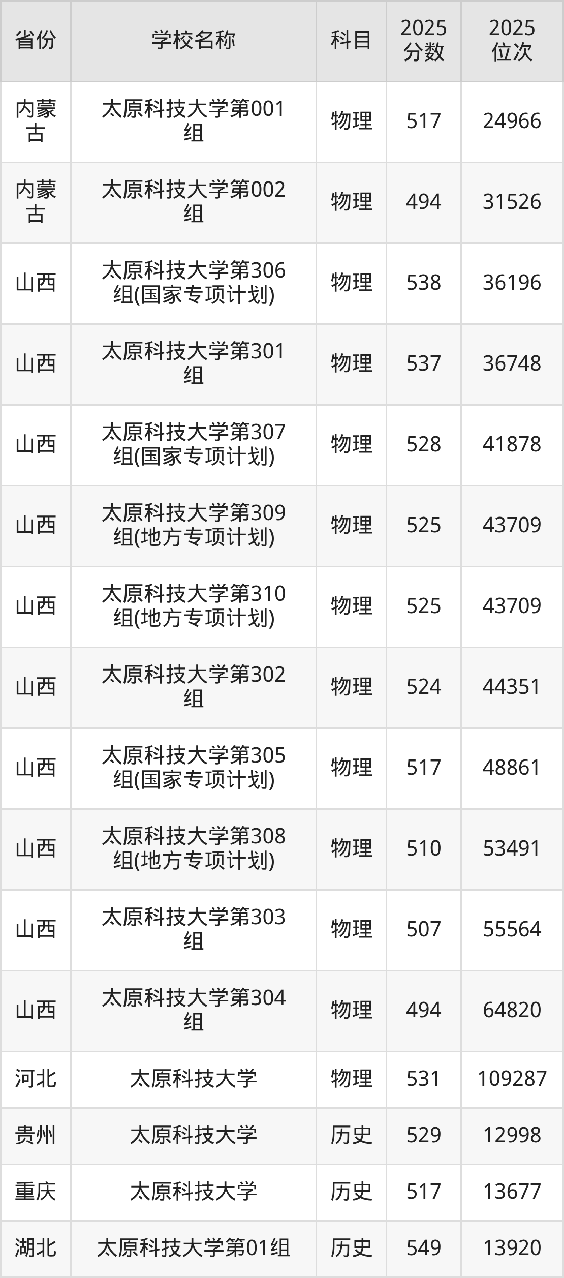 二、太原科技大学各专业录取分数线