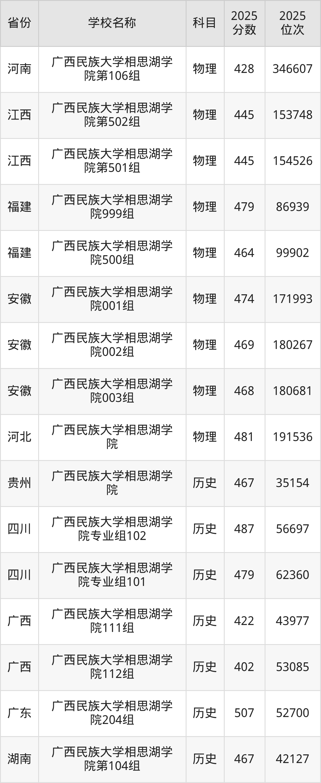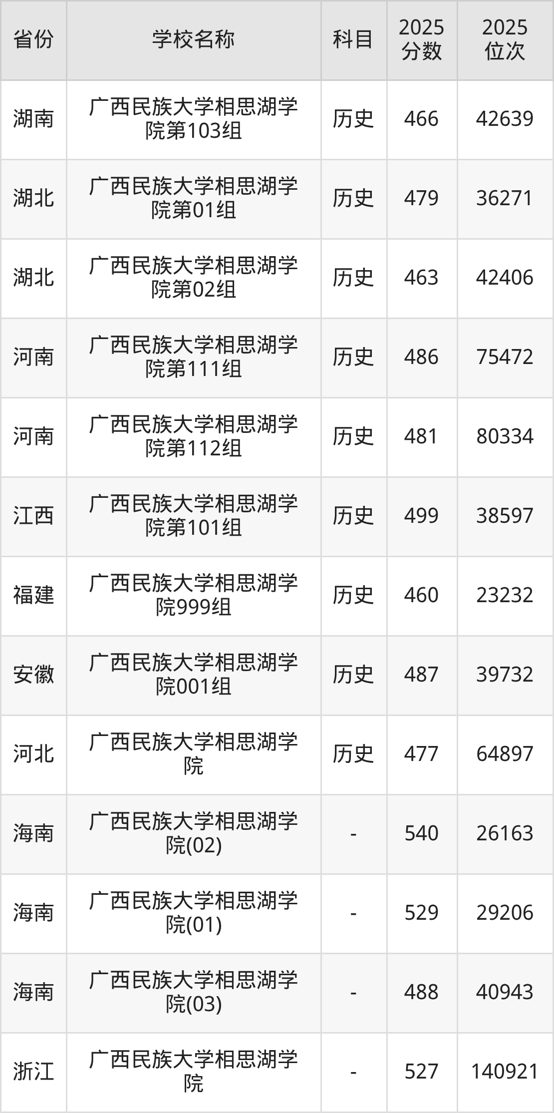 广西民族大学相思湖学院2025年有2个专业组面向广西壮族自治区内首选了历史科目的考生招生: