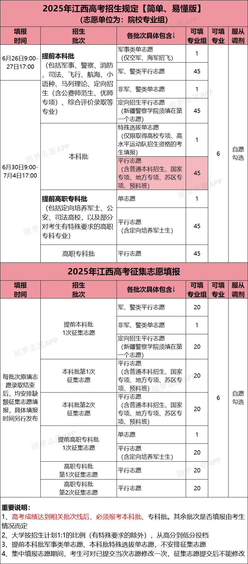 2026年江西高考志愿填报分为本科提前批、本科批和高职(专科)批,不同批次的志愿设置和填报方式各有区别。本科提前批平行志愿最多可填报45个院校专业组;本科批普通志愿栏同样可填报45个平行志愿;高职(专科)批普通志愿最多也可填报45个平行志愿。