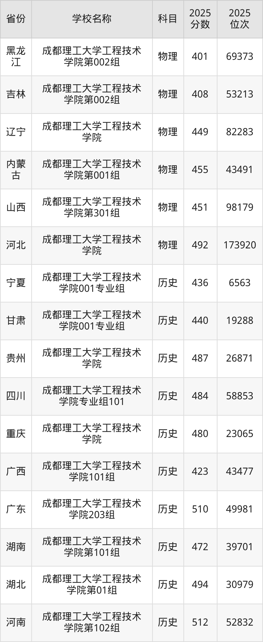 成都理工大学工程技术学院2025年有1个专业组面向四川省内首选了历史科目的考生招生: