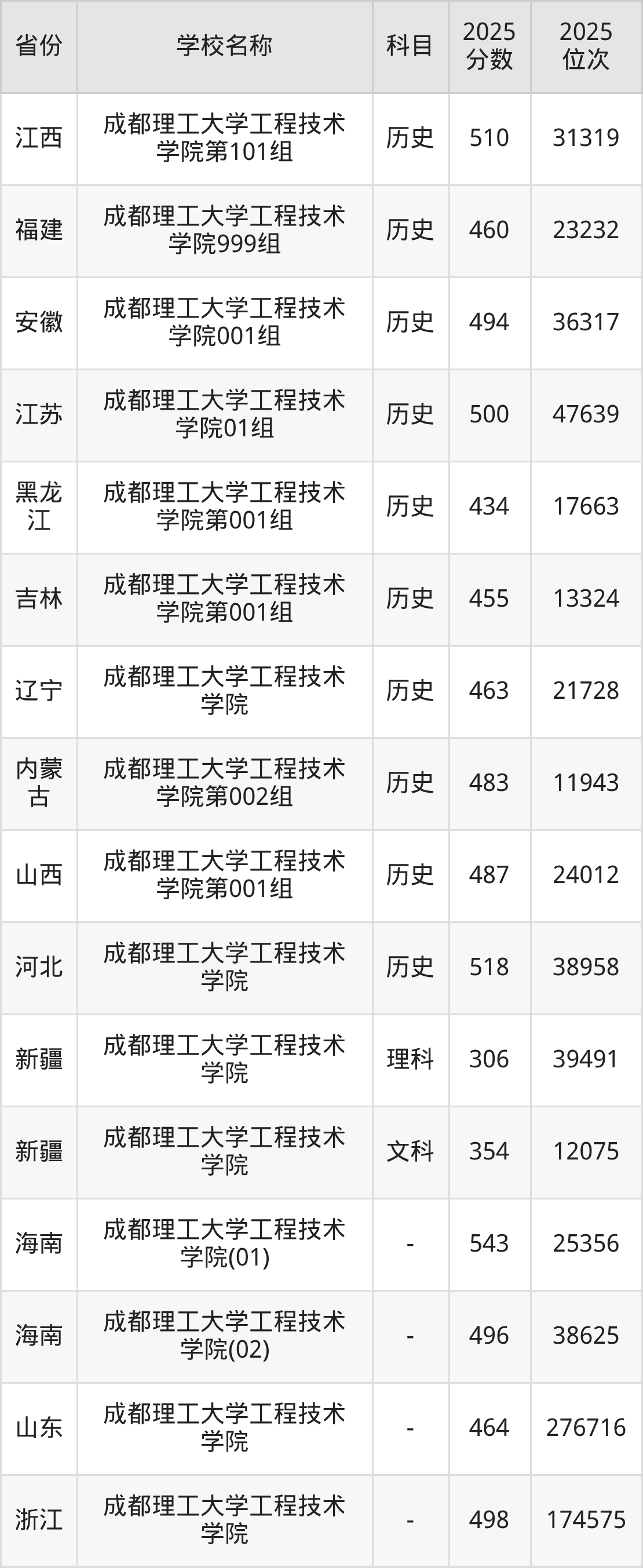 二、成都理工大学工程技术学院各专业录取分数线