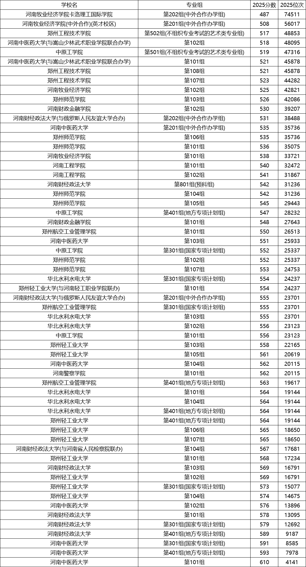 对于历史类考生而言,河南省郑州市的二本公办大学最低487就能考上,对应的收分最低的二本公办大学是河南牧业经济学院卡洛理工国际学院第202组(中外合作办学组)。