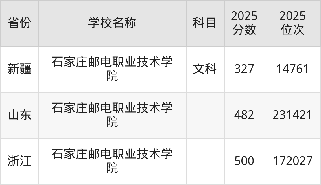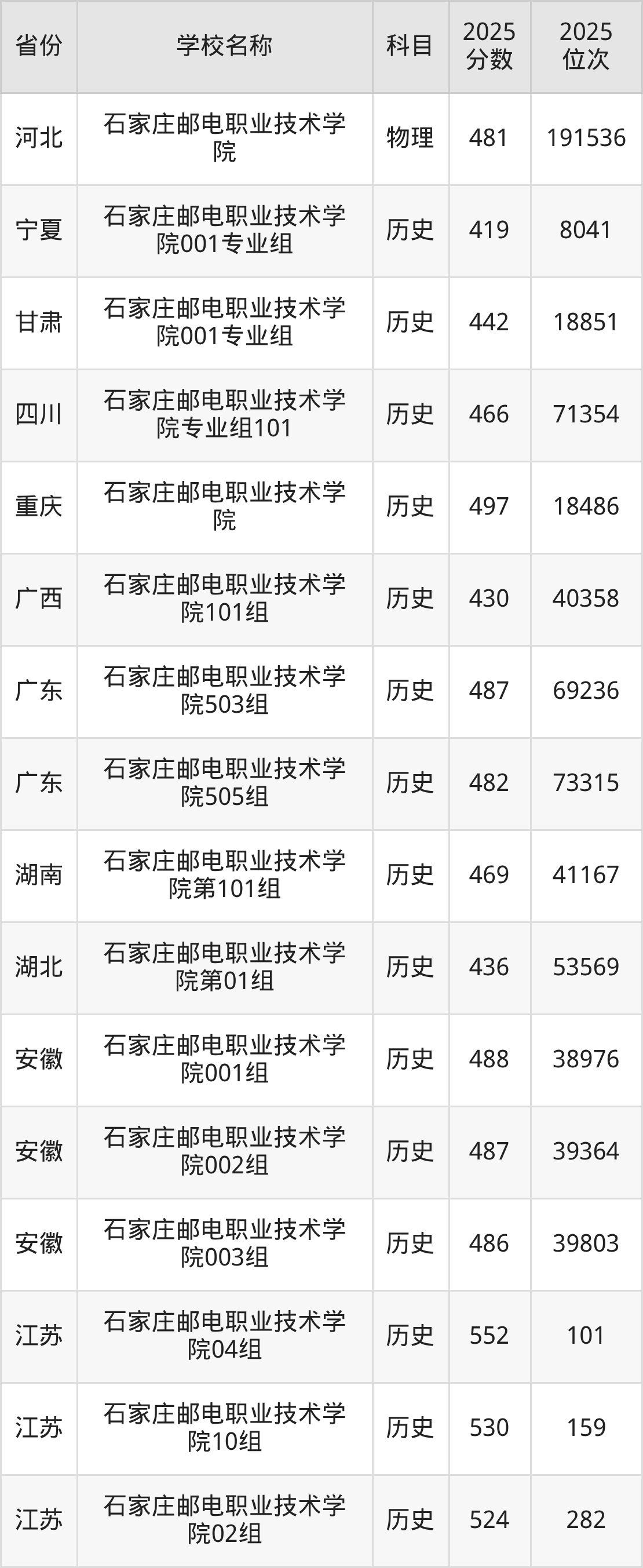 2025年石家庄邮电职业技术学院在全国各省专科的最低录取分数线在284~552分之间。江苏物理类高考生最低503分能上石家庄邮电职业技术学院、浙江高考生最低500分能上石家庄邮电职业技术学院……下文将展示石家庄邮电职业技术学院在全国19个高考省份中的专科最低投档录取分汇总!