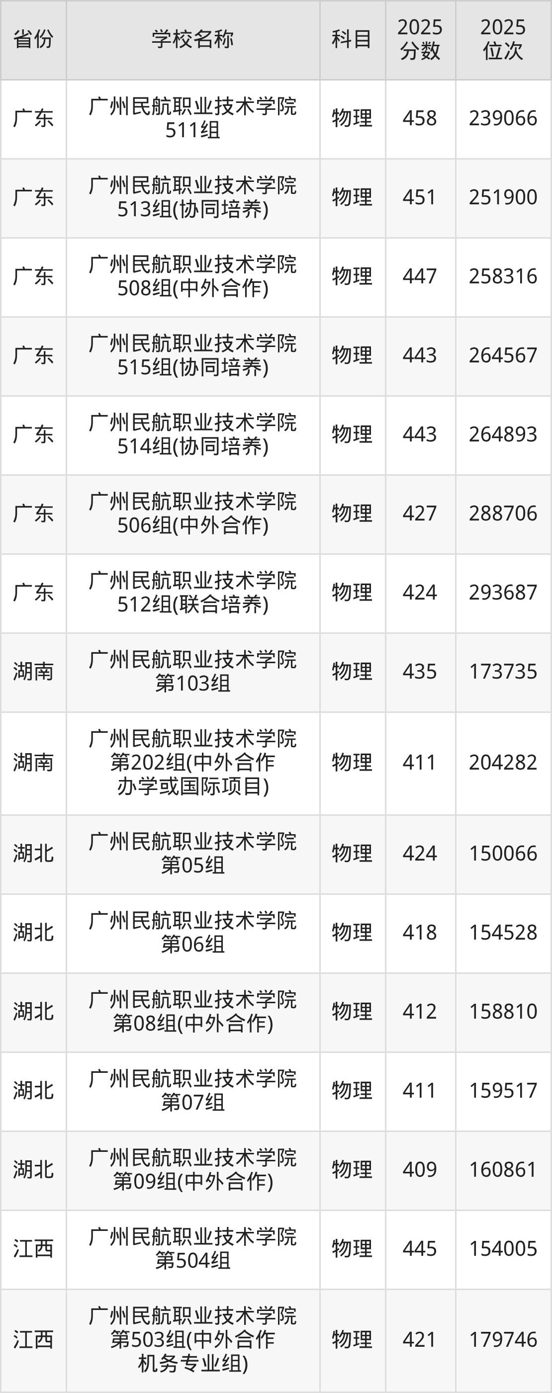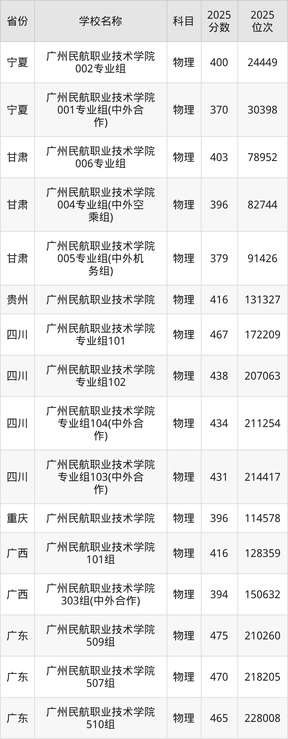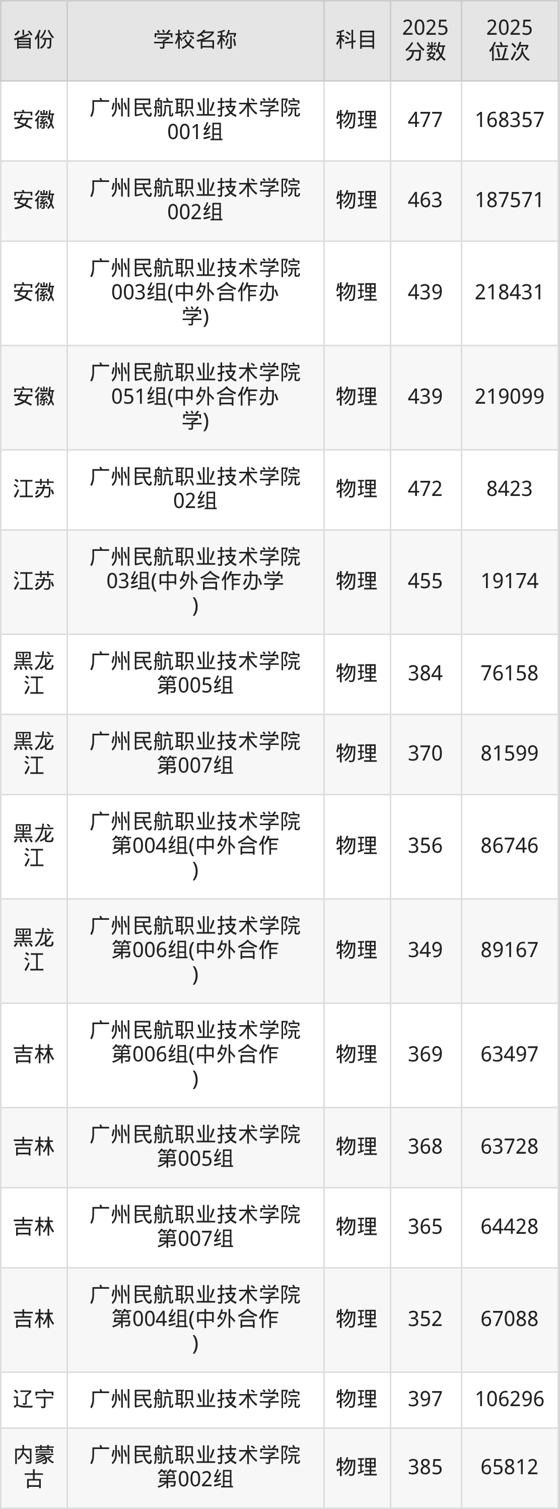 广州民航职业技术学院2025年有10个专业组面向广东省内首选了物理科目的考生招生: