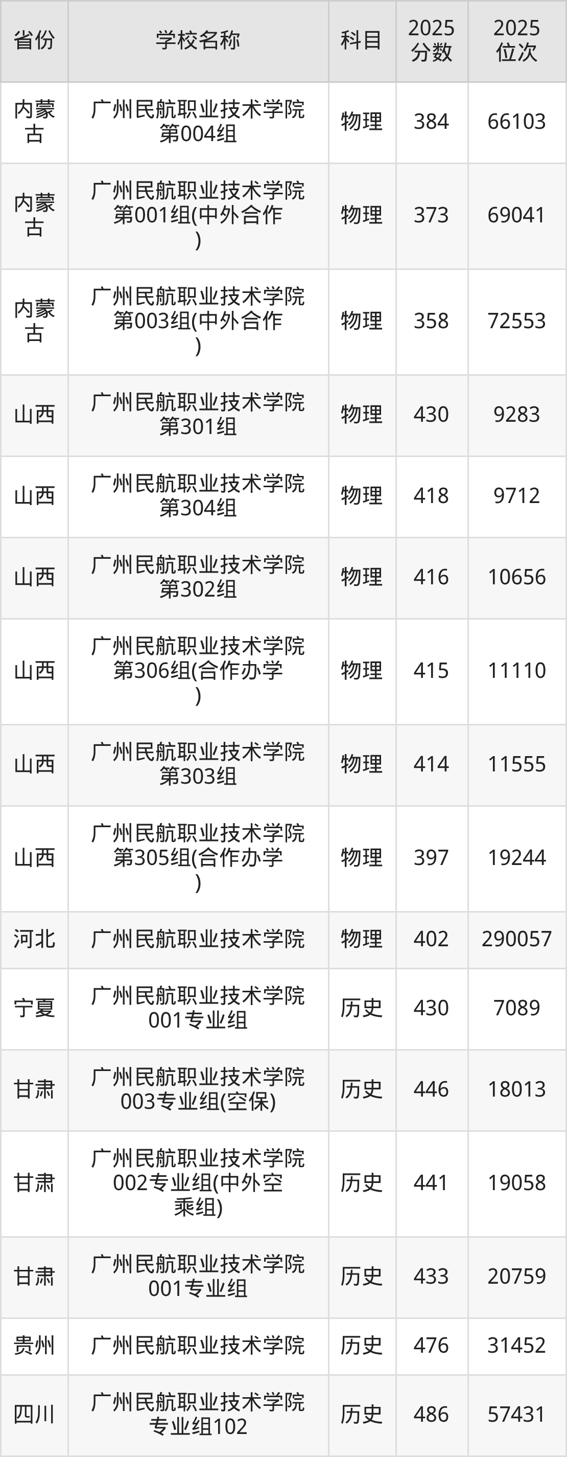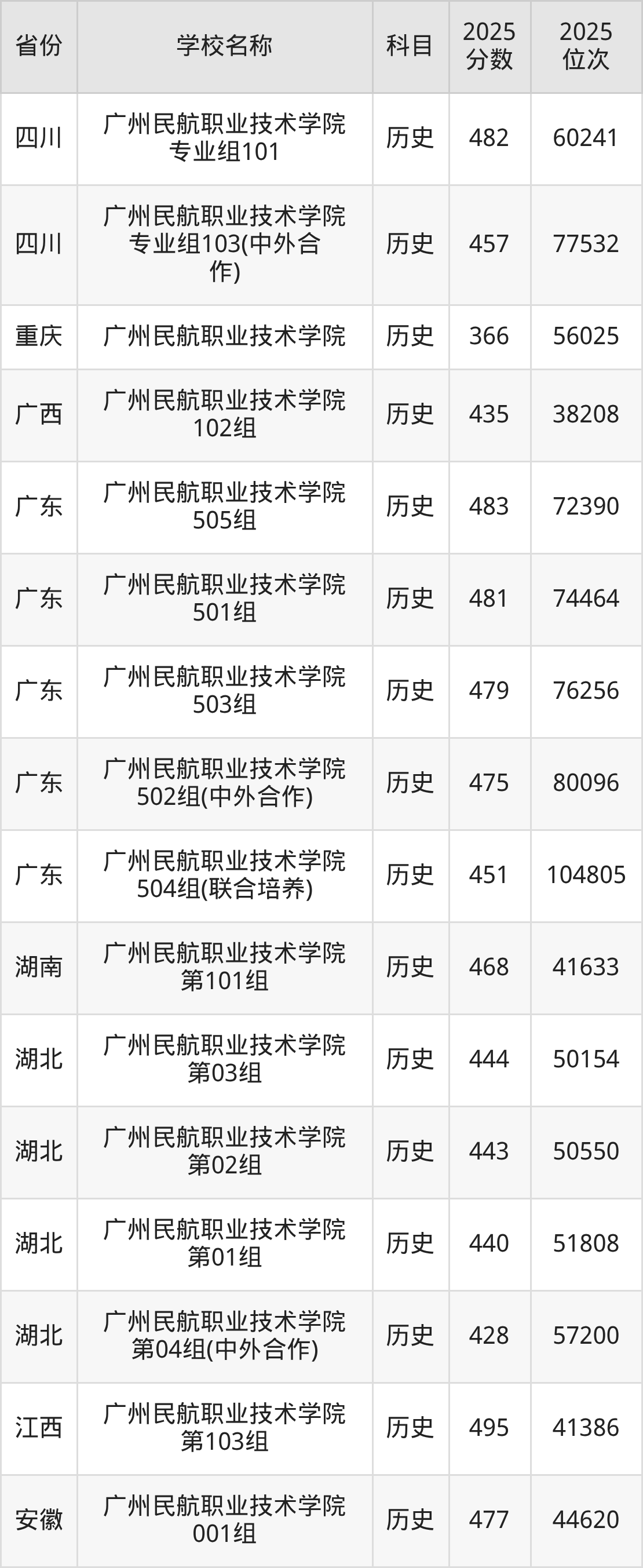 广州民航职业技术学院2025年有5个专业组面向广东省内首选了历史科目的考生招生: