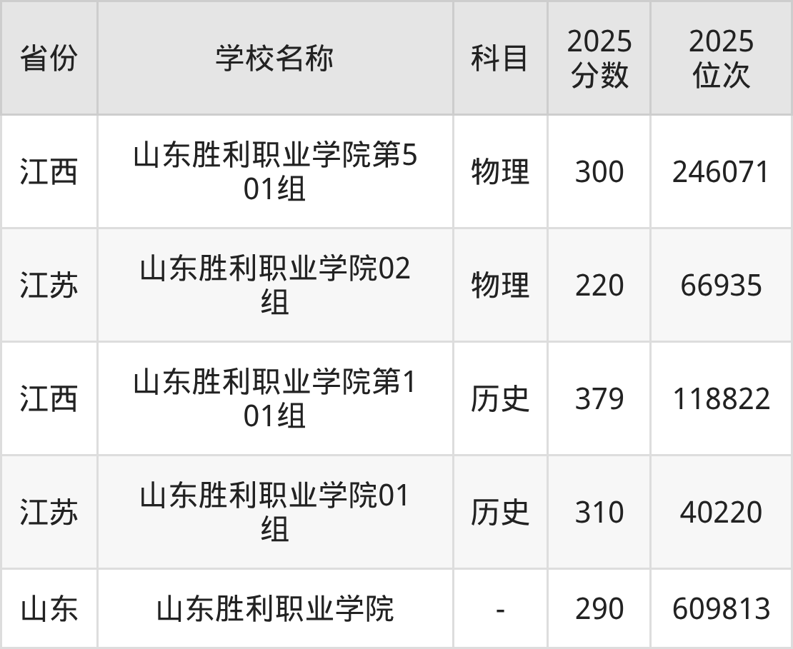2025年山东胜利职业学院在全国各省专科的最低录取分数线在220~379分之间。江西物理类高考生最低300分能上山东胜利职业学院、山东高考生最低290分能上山东胜利职业学院……下文将展示山东胜利职业学院在全国3个高考省份中的专科最低投档录取分汇总!