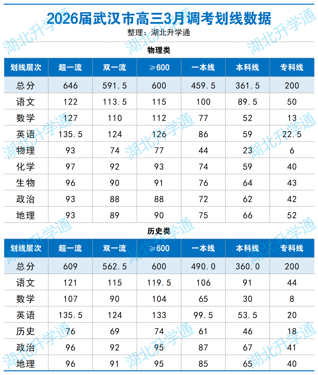 2026届武汉市高三三月调考官方划线正式公布!本次调考作为高考前最重要的模拟考试之一,划线数据对于考生定位、志愿填报具有重要参考价值。物理方向超一流线646分,双一流线591.5分,一本线459.5分,本科线361.5分;历史方向超一流线609分,双一流线562.5分,一本线490分,本科线360分。