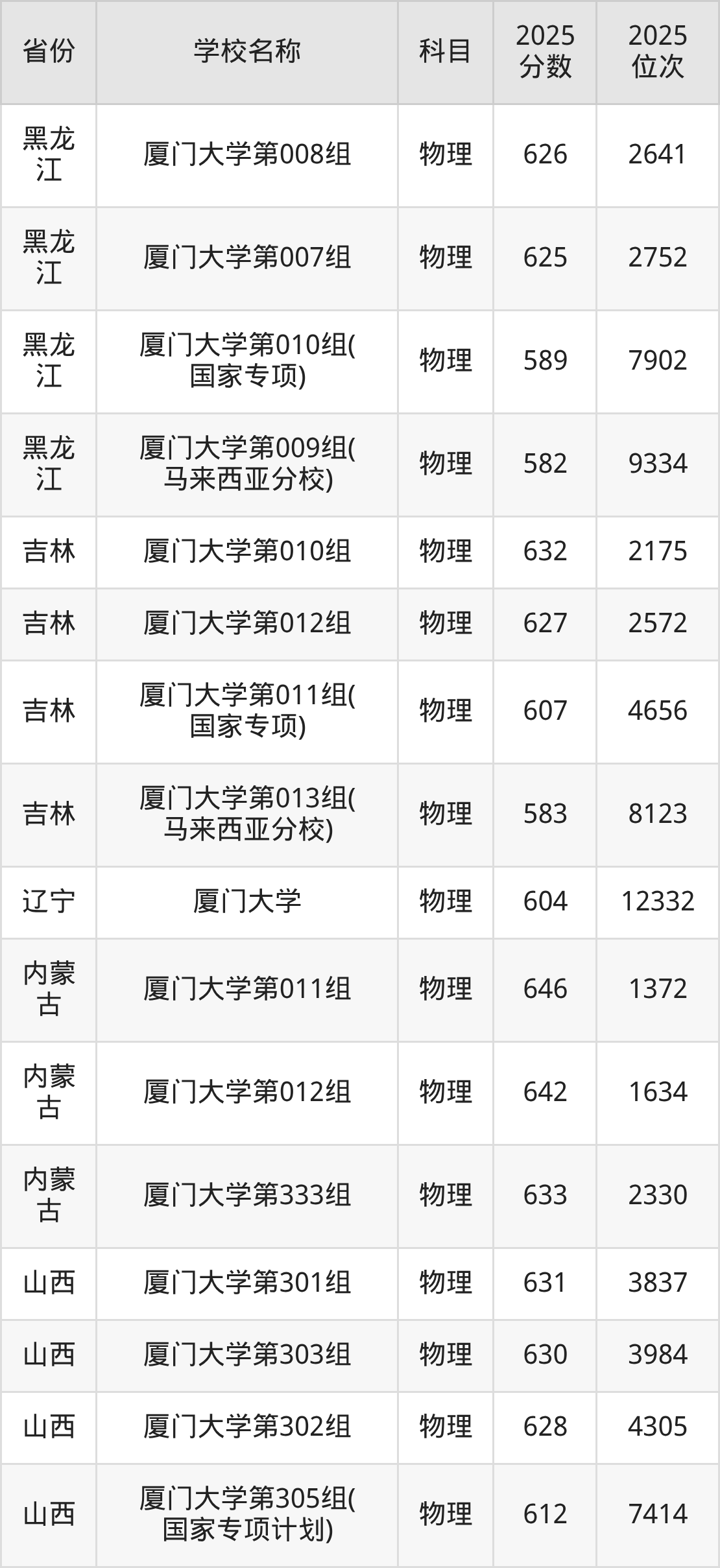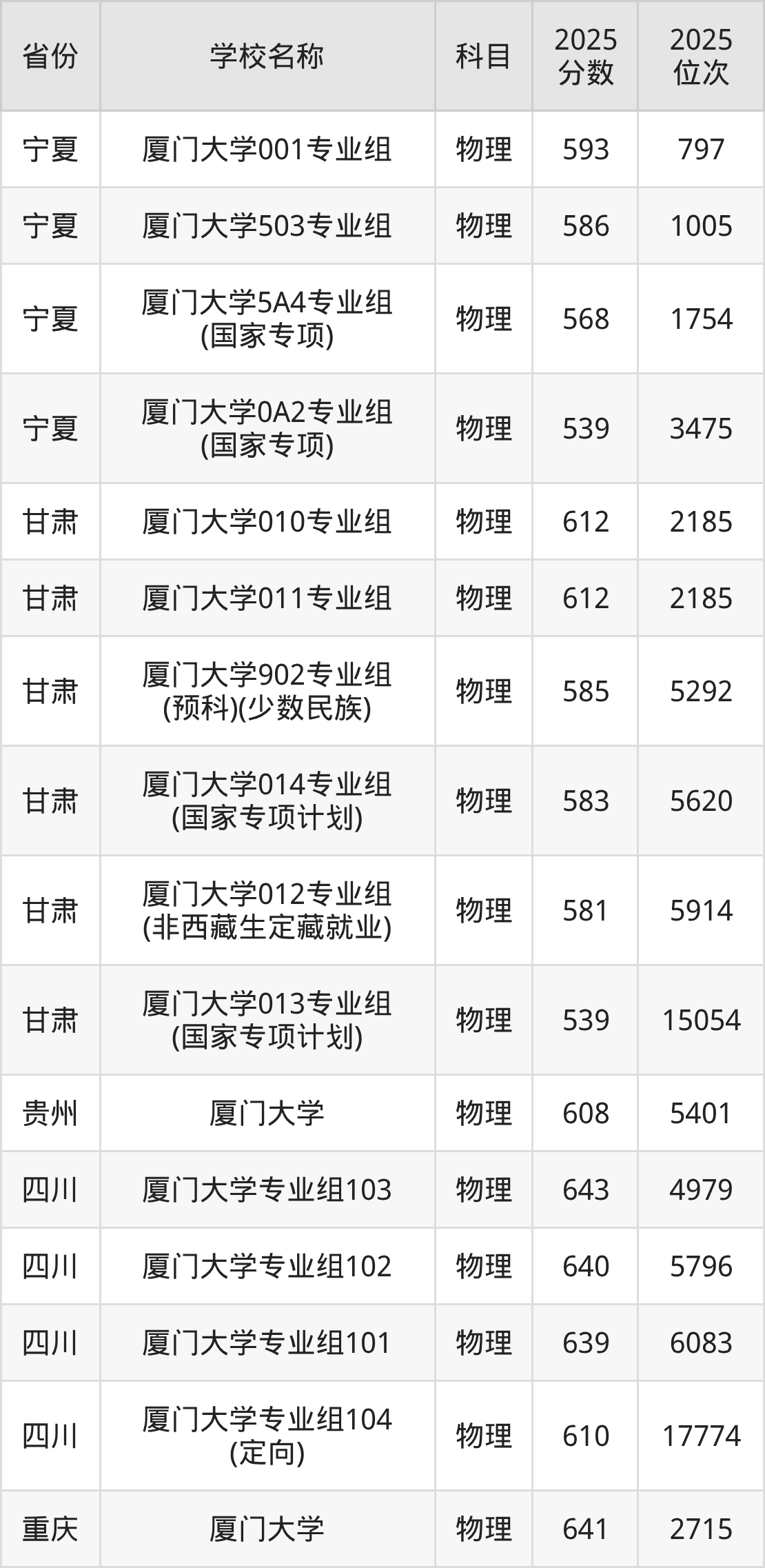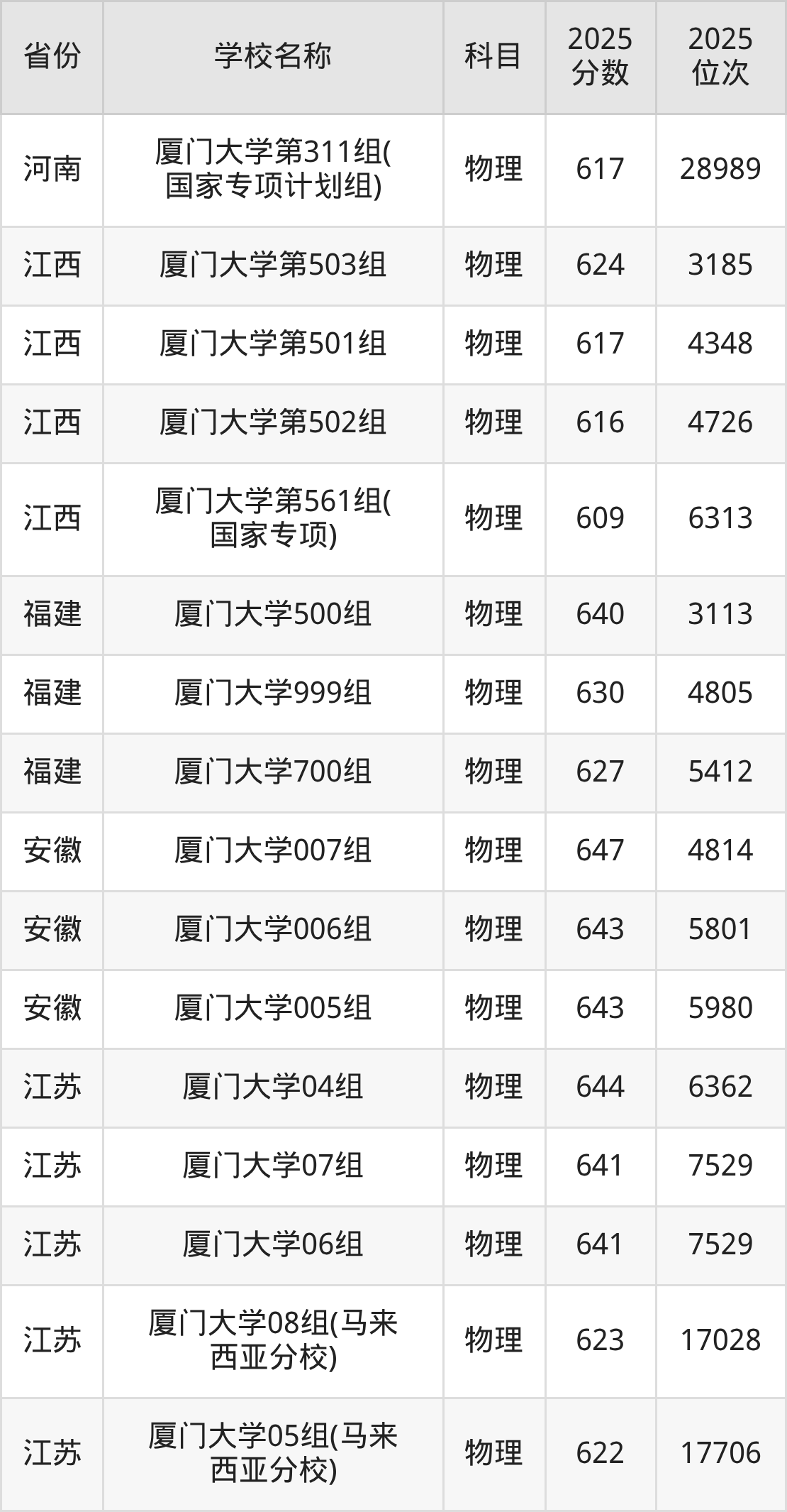 厦门大学2025年有3个专业组面向福建省内首选了物理科目的考生招生: