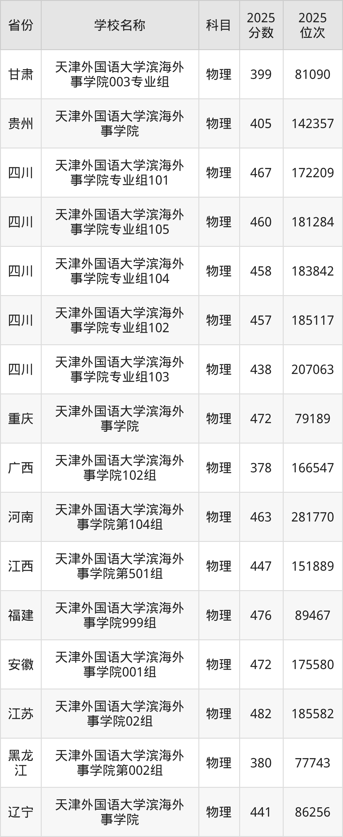 二、天津外国语大学滨海外事学院各专业录取分数线