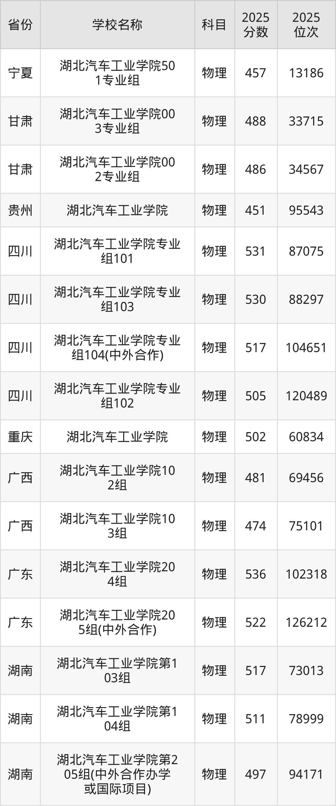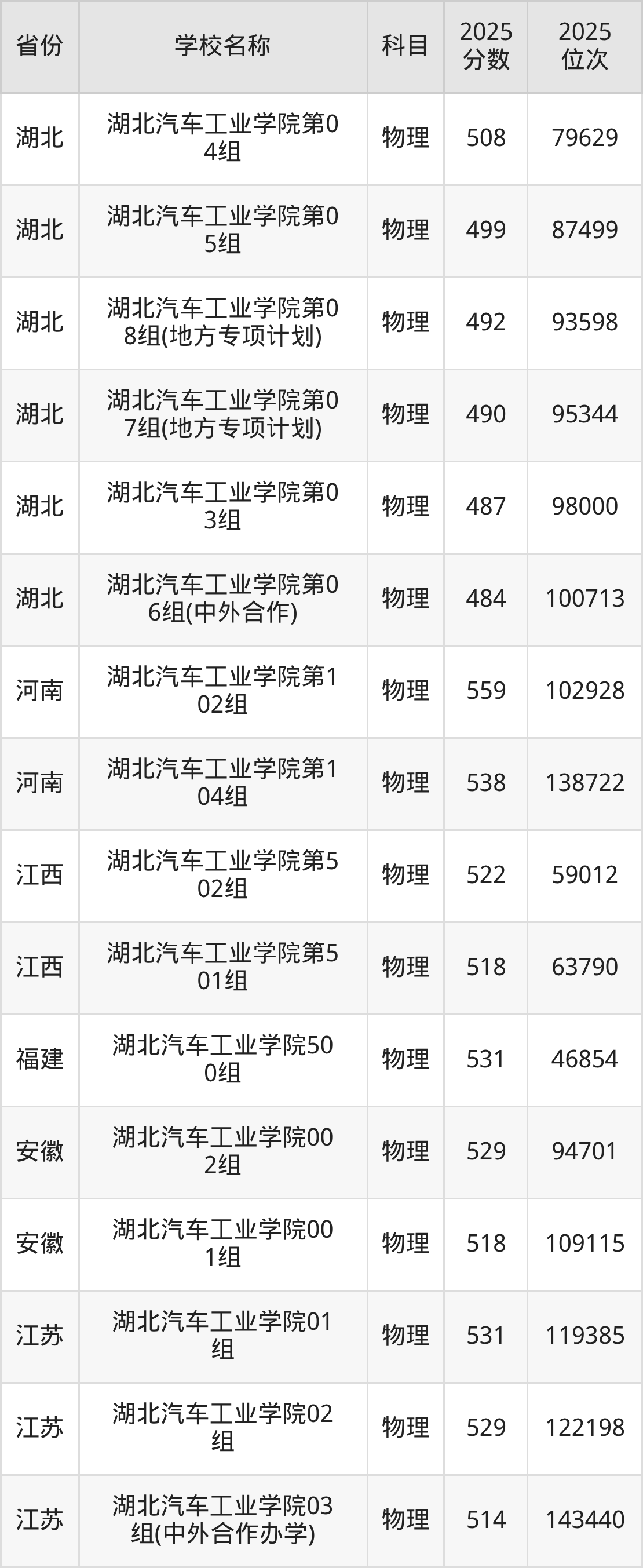 湖北汽车工业学院2025年有6个专业组面向湖北省内首选了物理科目的考生招生: