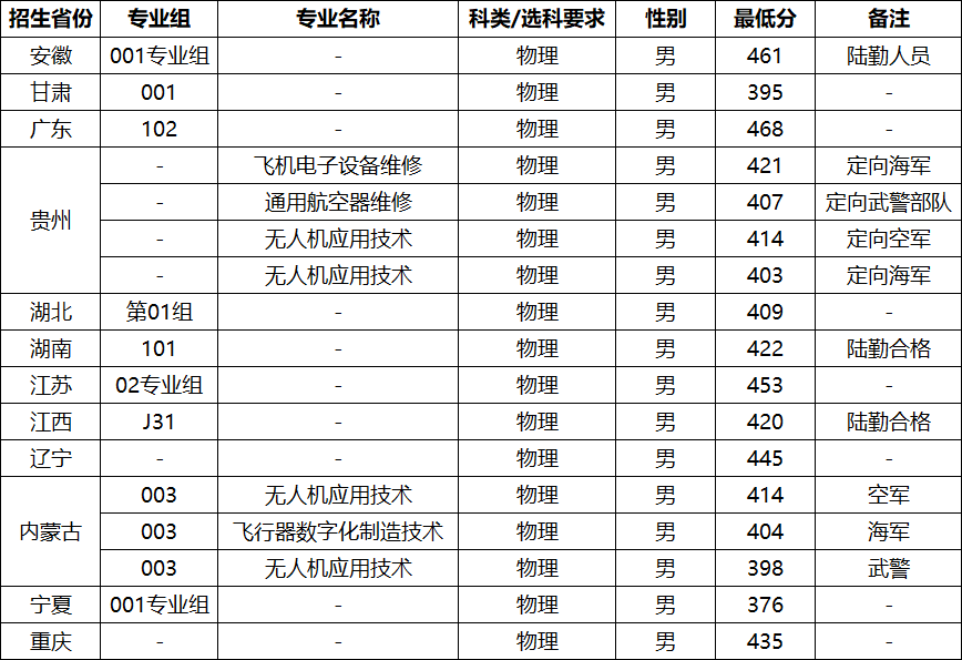 空军:飞机机电设备维修(100人)、飞机电子设备维修(80人)、无人机应用技术(80人)、飞行器数字化制造技术(60人)