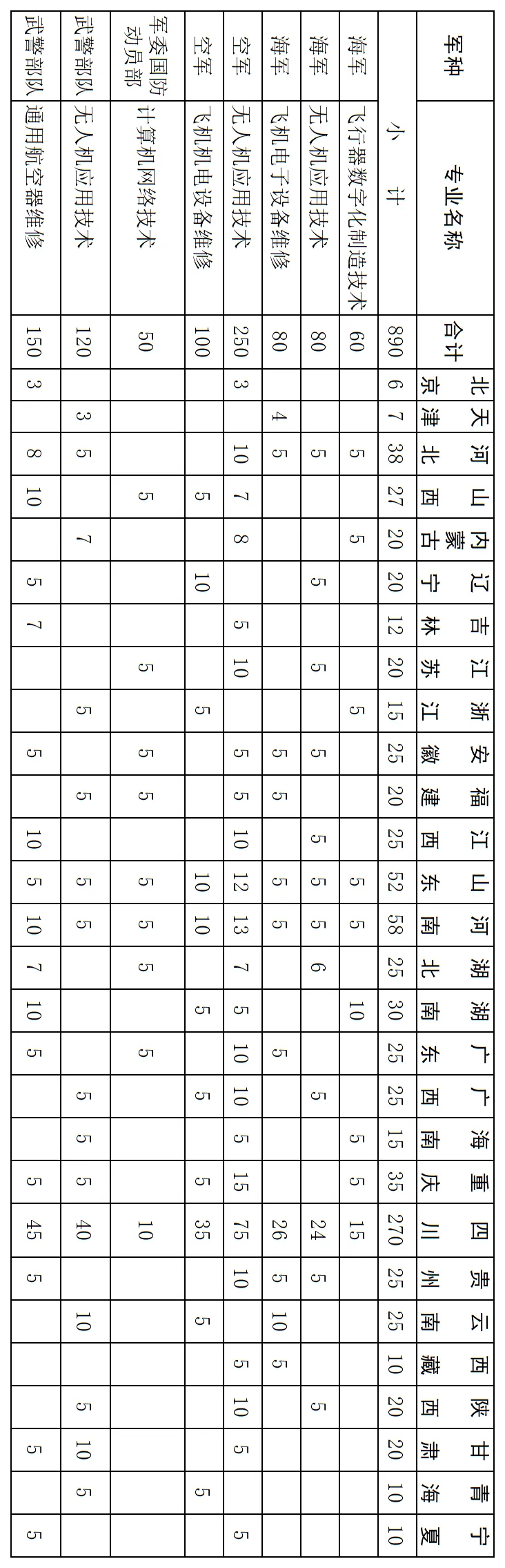 武警部队:通用航空器维修(150人)、无人机应用技术(120人)、计算机网络技术(50人)