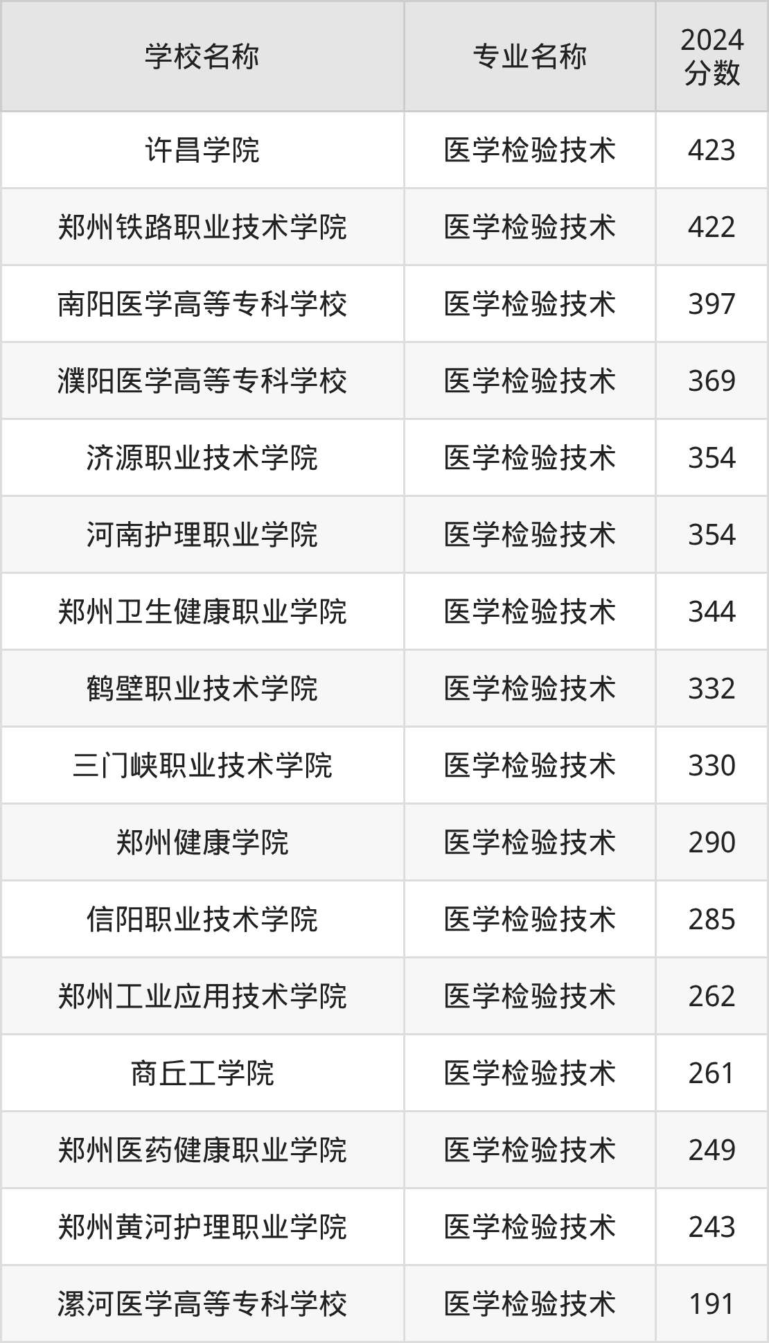| 河南医学高等专科学校 | 医学检验技术 | 382 |