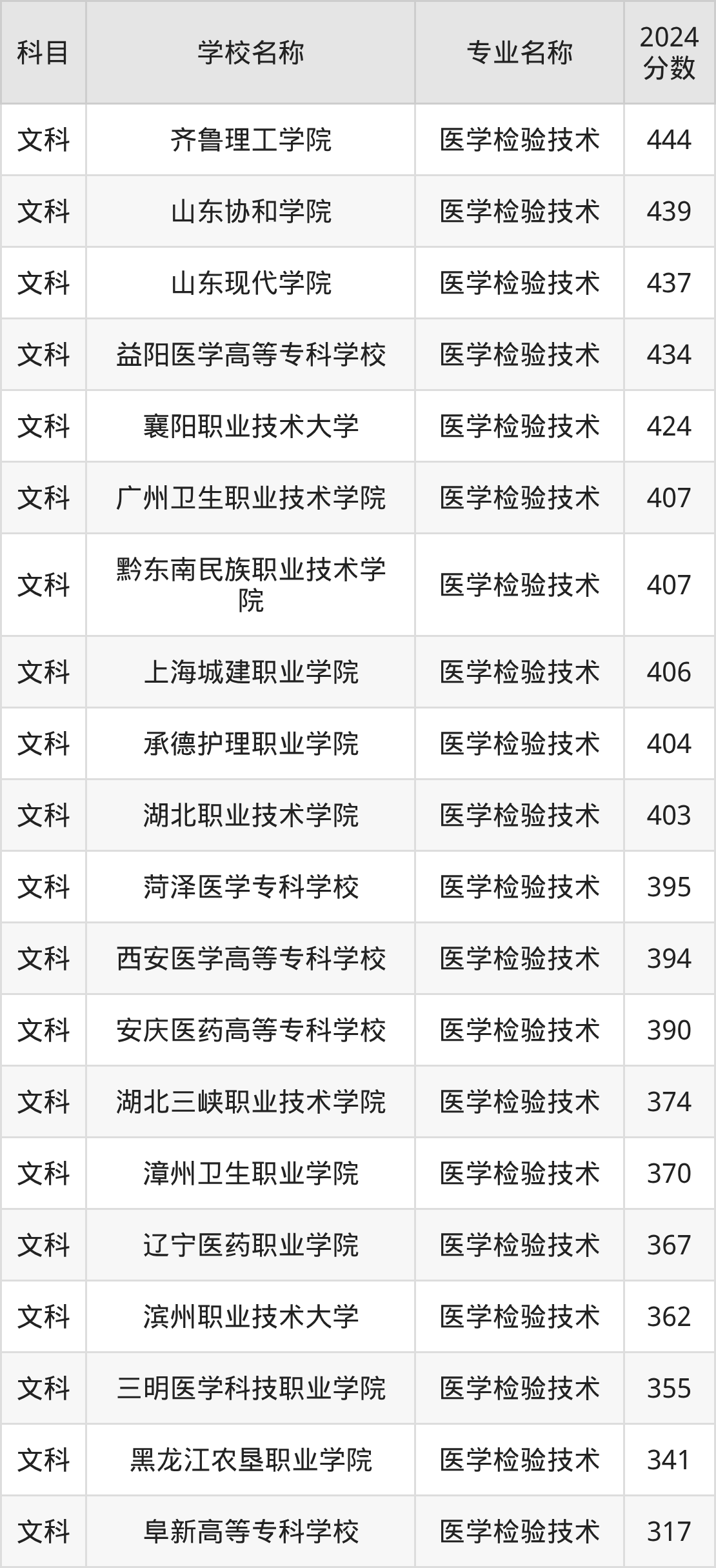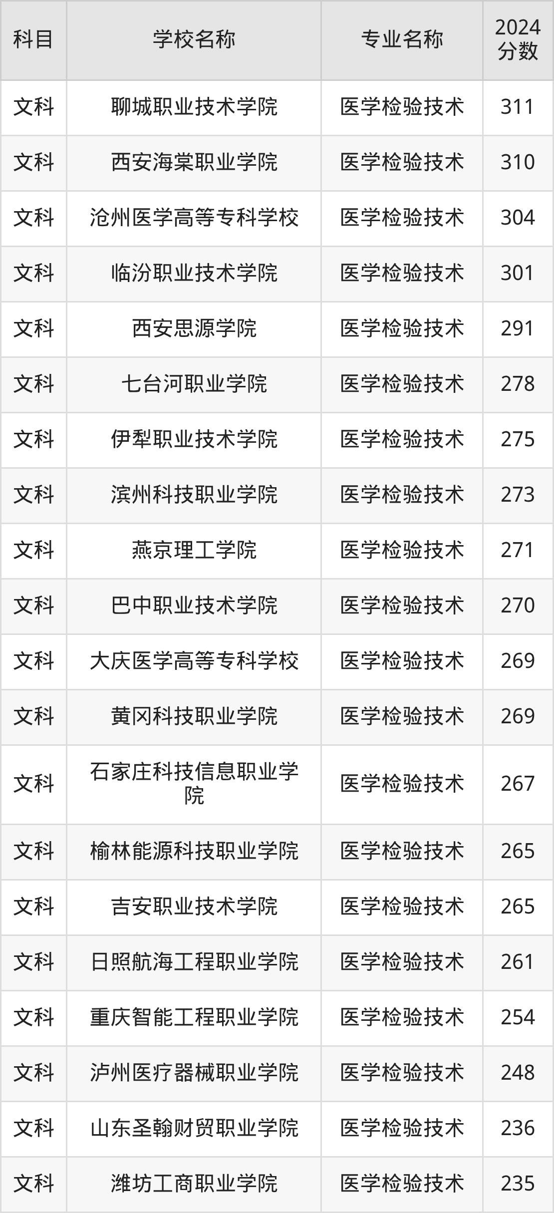 | 三门峡职业技术学院 | 医学检验技术 | 336 |