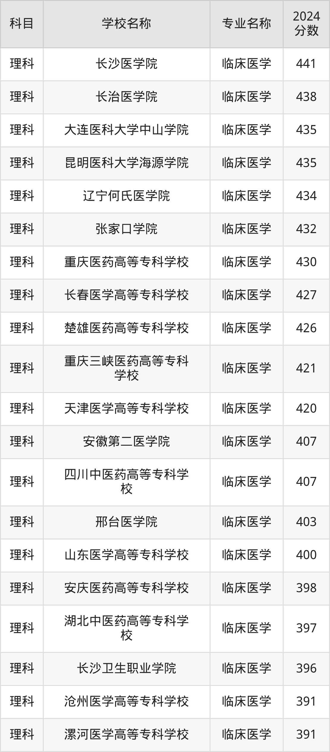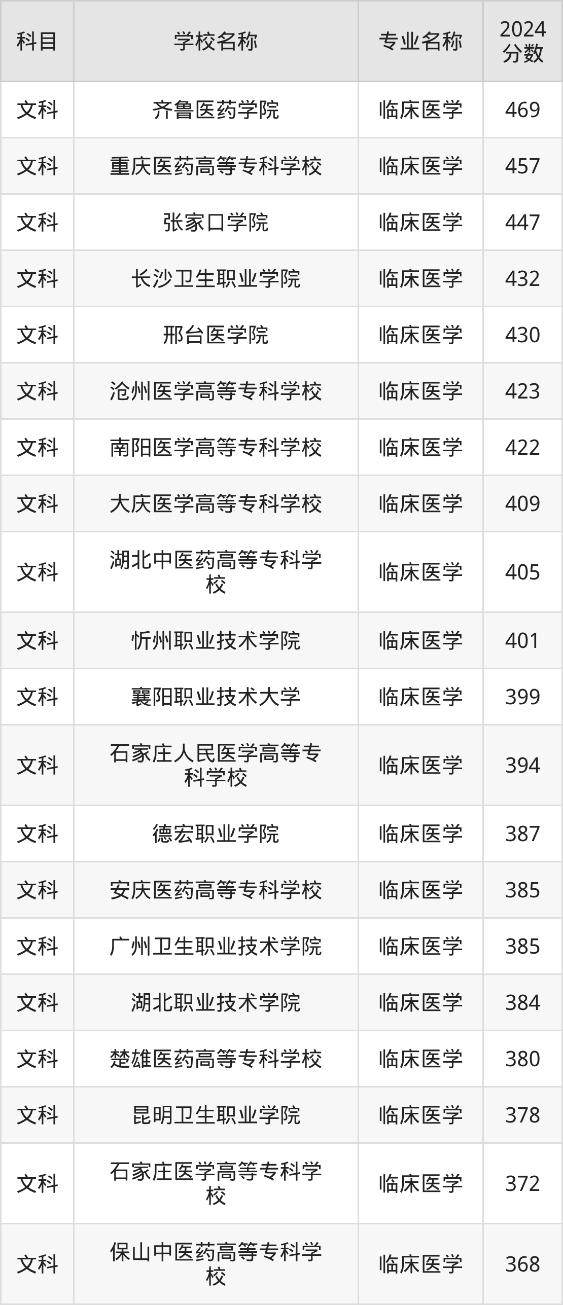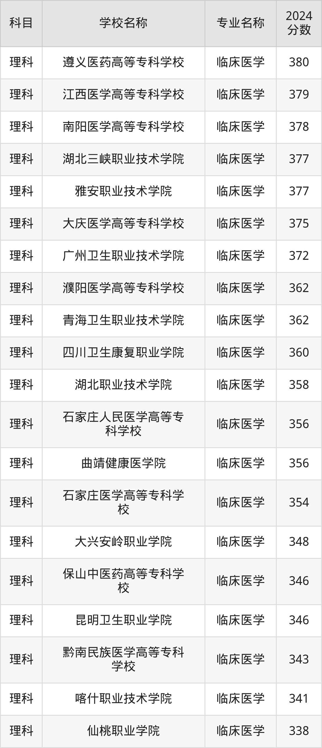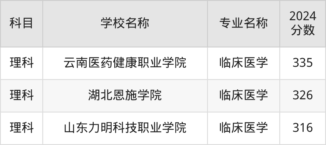 | 汉中职业技术学院 | 临床医学 | 370 |