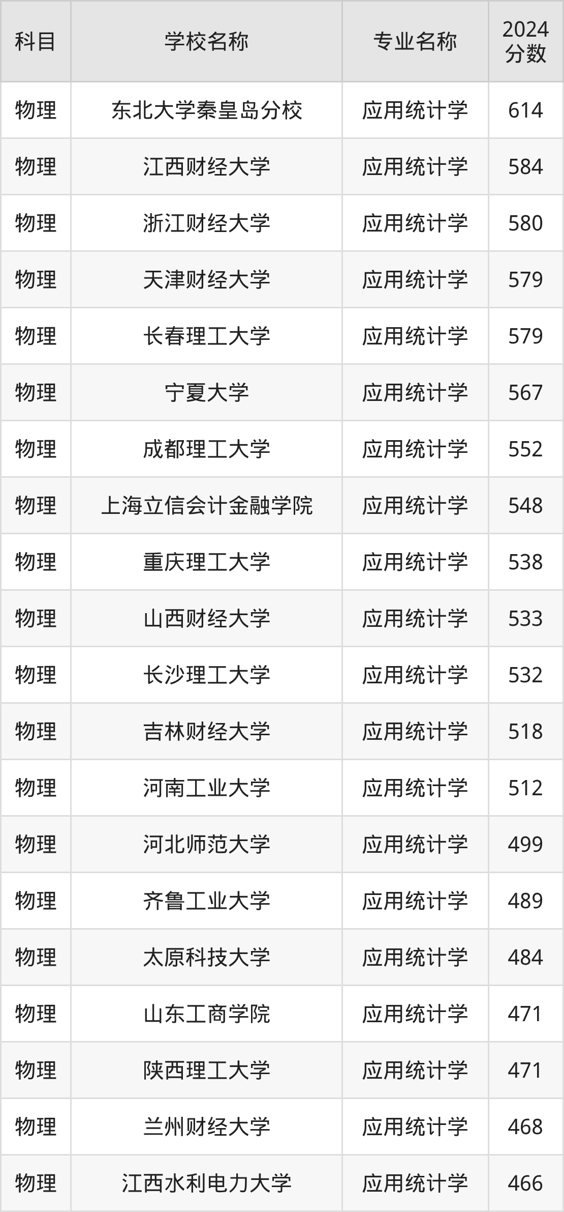 通过上文大家可以知晓,在黑龙江省内招应用统计学专业的院校数量较少,所以下文将为2026届高考生继续展示:省外大学的应用统计学专业2024年在黑龙江高考的录取情况,包含东北大学秦皇岛分校、江西财经大学、浙江财经大学、天津财经大学、长春理工大学。
