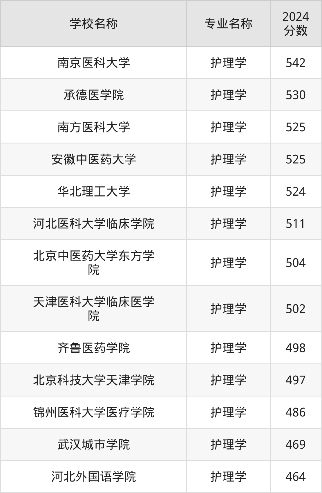通过上文大家可以知晓,在北京市内招护理学专业的院校数量较少,所以下文将为2026届高考生继续展示:市外大学的护理学专业2024年在北京高考的录取情况,包含南京医科大学、承德医学院、南方医科大学、安徽中医药大学、华北理工大学。