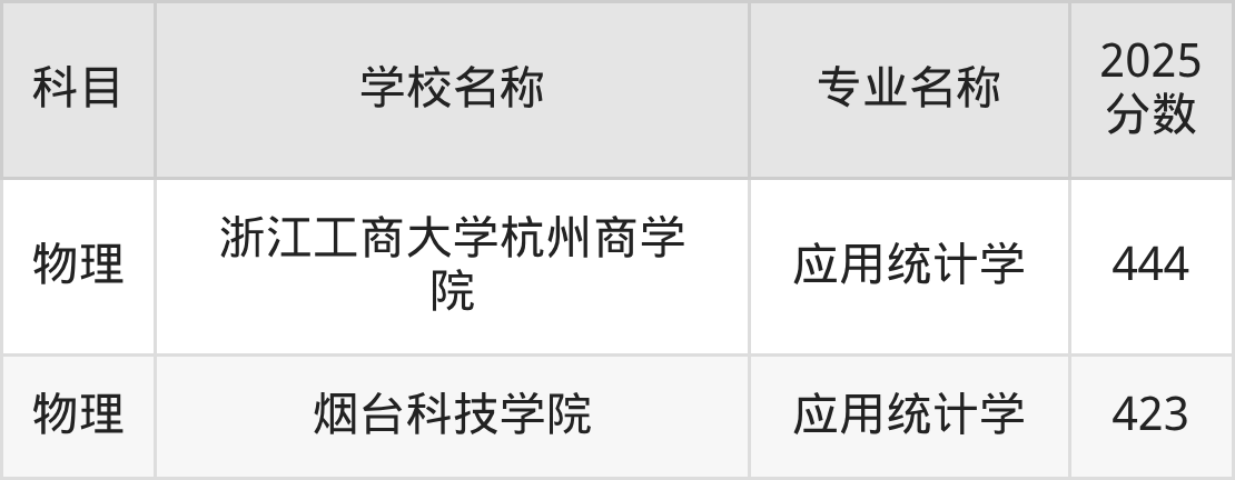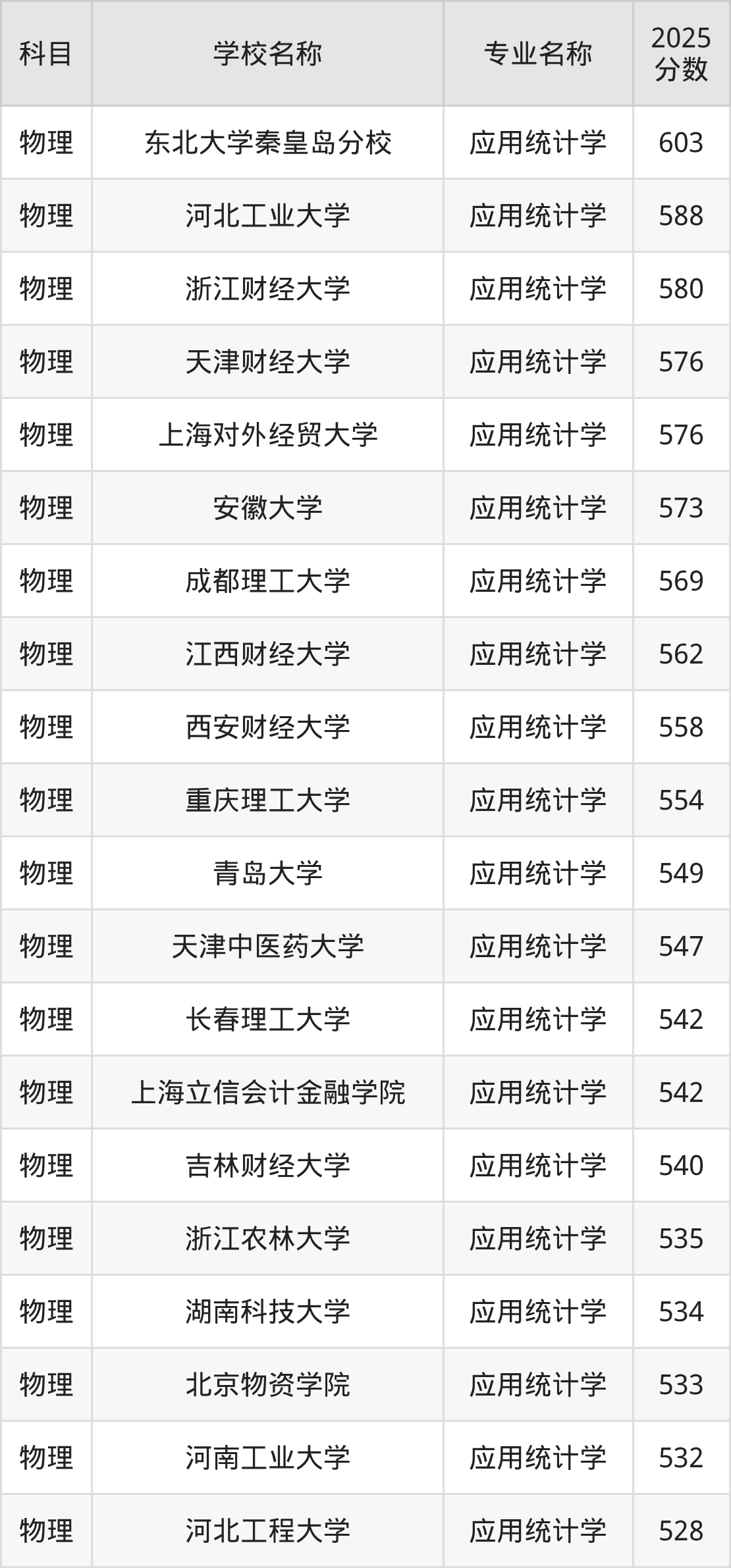 通过上文大家可以知晓,在山西省内招应用统计学专业的院校数量较少,所以下文将为2026届高考生继续展示:省外大学的应用统计学专业2025年在山西高考的录取情况,包含东北大学秦皇岛分校、河北工业大学、浙江财经大学、天津财经大学、上海对外经贸大学。