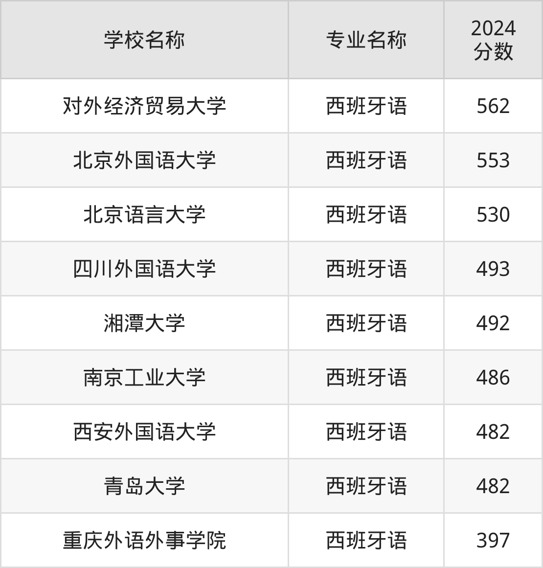 通过上文大家可以知晓,在上海市内招西班牙语专业的院校数量较少,所以下文将为2025届高考生继续展示:市外大学的西班牙语专业2024年在上海高考的录取情况,包含对外经济贸易大学、北京外国语大学、北京语言大学、四川外国语大学、湘潭大学。