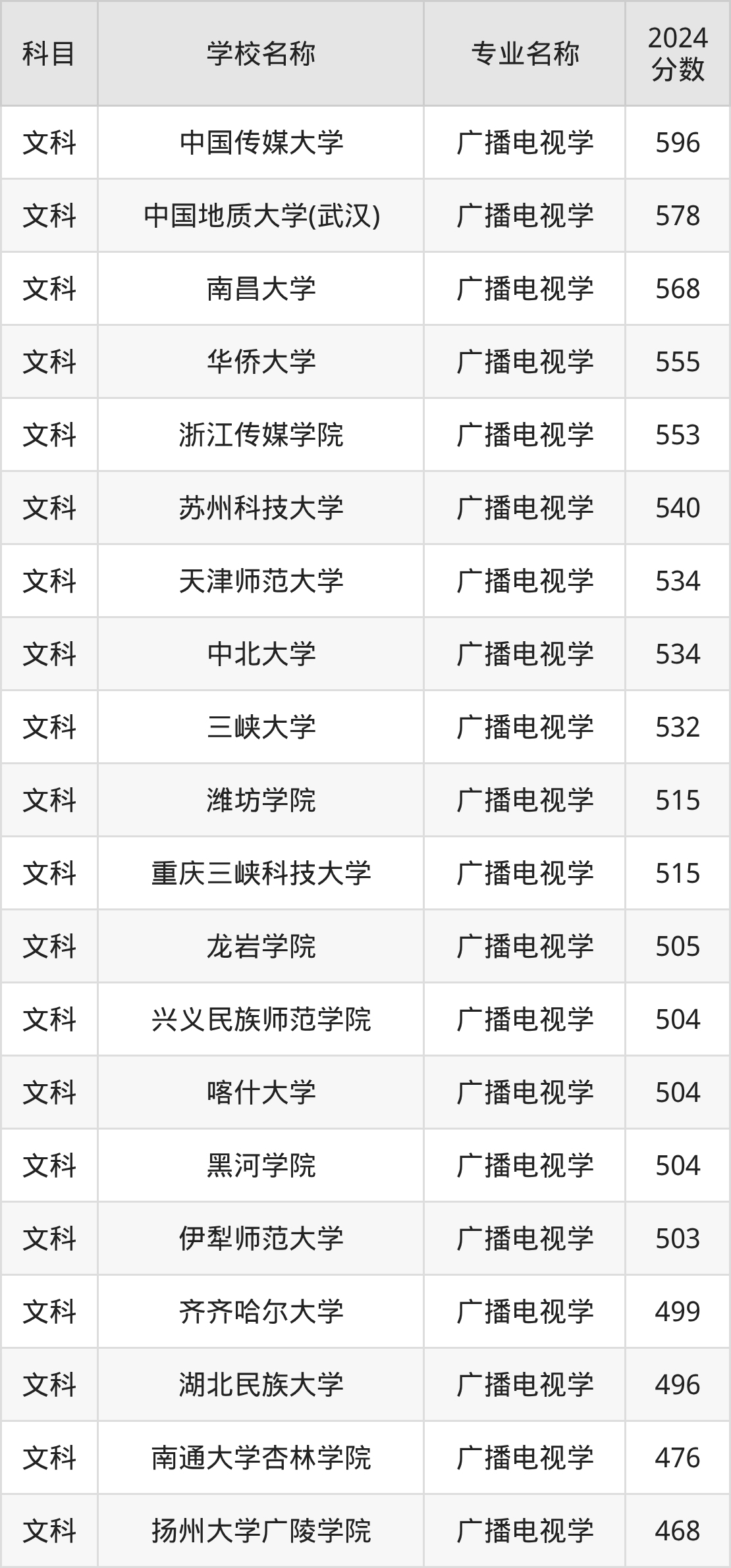通过上文大家可以知晓,在四川省内招广播电视学专业的院校数量较少,所以下文将为2026届高考生继续展示:省外大学的广播电视学专业2024年在四川高考的录取情况,包含中国传媒大学、中国地质大学(武汉)、南昌大学、华侨大学、浙江传媒学院。