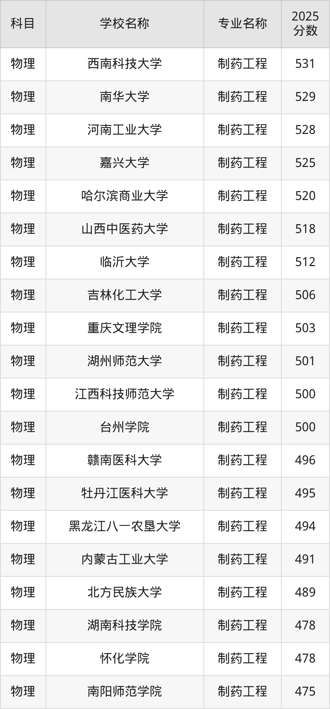 | 沈阳药科大学 | 制药工程 | 536 |
