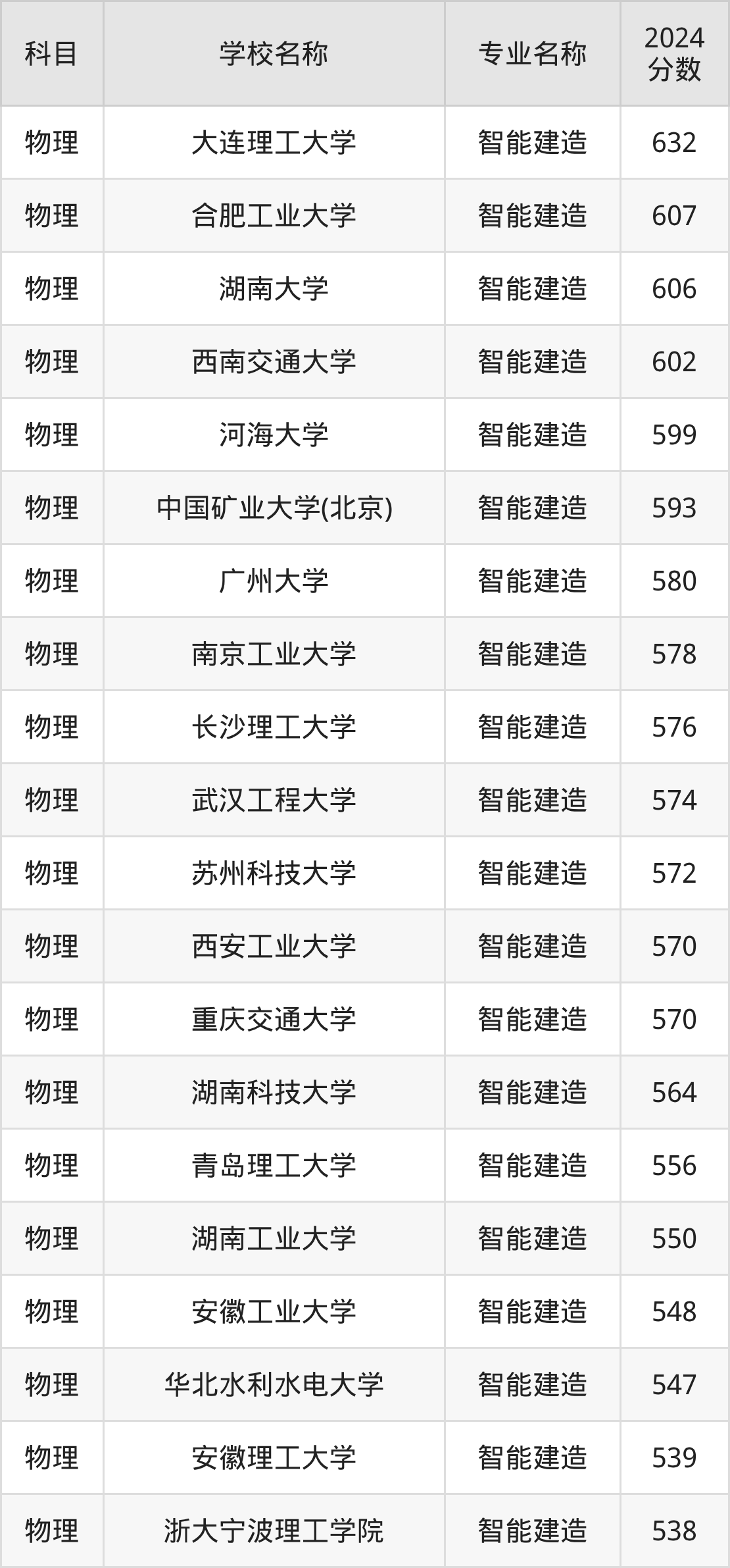 通过上文大家可以知晓,在江西省内招智能建造专业的院校数量较少,所以下文将为2026届高考生继续展示:省外大学的智能建造专业2024年在江西高考的录取情况,包含大连理工大学、合肥工业大学、湖南大学、西南交通大学、河海大学。