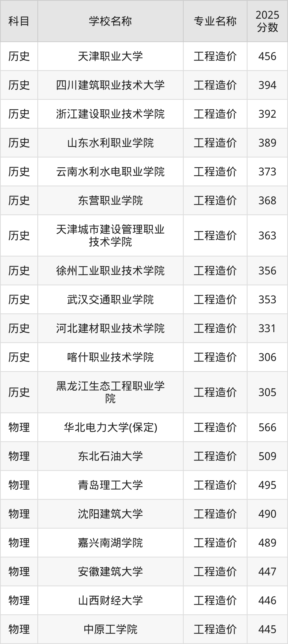 通过上文大家可以知晓,在吉林省内招工程造价专业的院校数量较少,所以下文将为2026届高考生继续展示:省外大学的工程造价专业2025年在吉林高考的录取情况,包含天津职业大学、四川建筑职业技术大学、浙江建设职业技术学院、山东水利职业学院、云南水利水电职业学院。