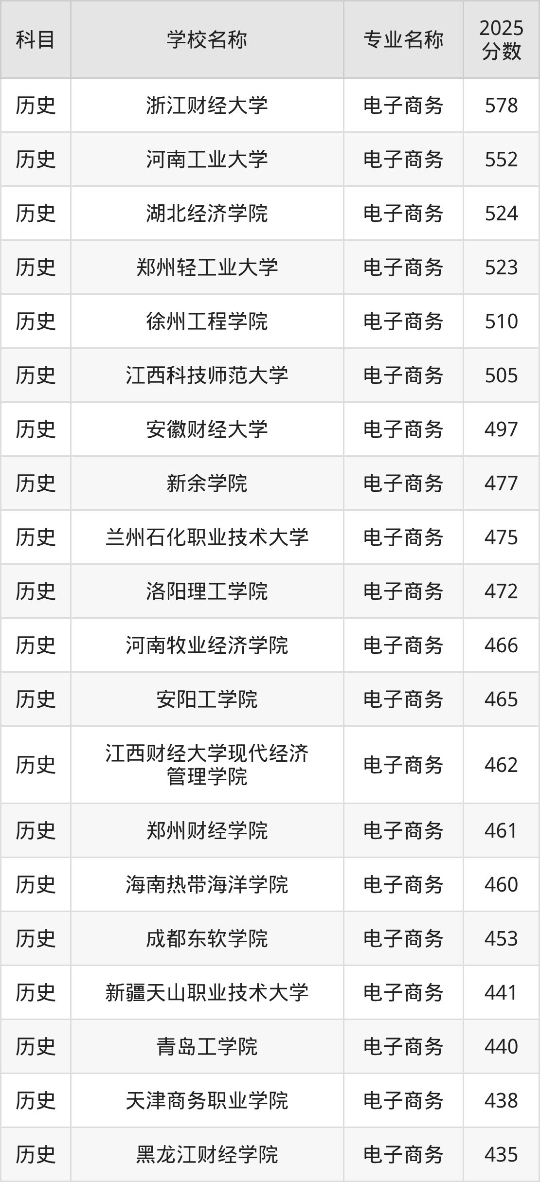 通过上文大家可以知晓,在吉林省内招电子商务专业的院校数量较少,所以下文将为2026届高考生继续展示:省外大学的电子商务专业2025年在吉林高考的录取情况,包含浙江财经大学、河南工业大学、湖北经济学院、郑州轻工业大学、徐州工程学院。
