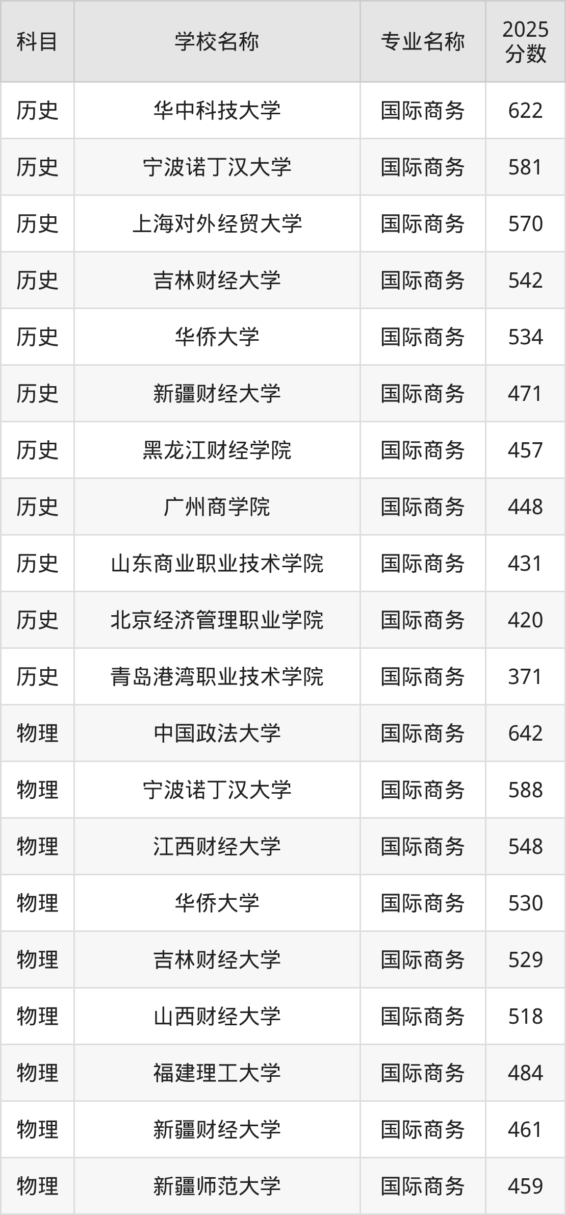 通过上文大家可以知晓,在辽宁省内招国际商务专业的院校数量较少,所以下文将为2026届高考生继续展示:省外大学的国际商务专业2025年在辽宁高考的录取情况,包含华中科技大学、宁波诺丁汉大学、上海对外经贸大学、吉林财经大学、华侨大学。