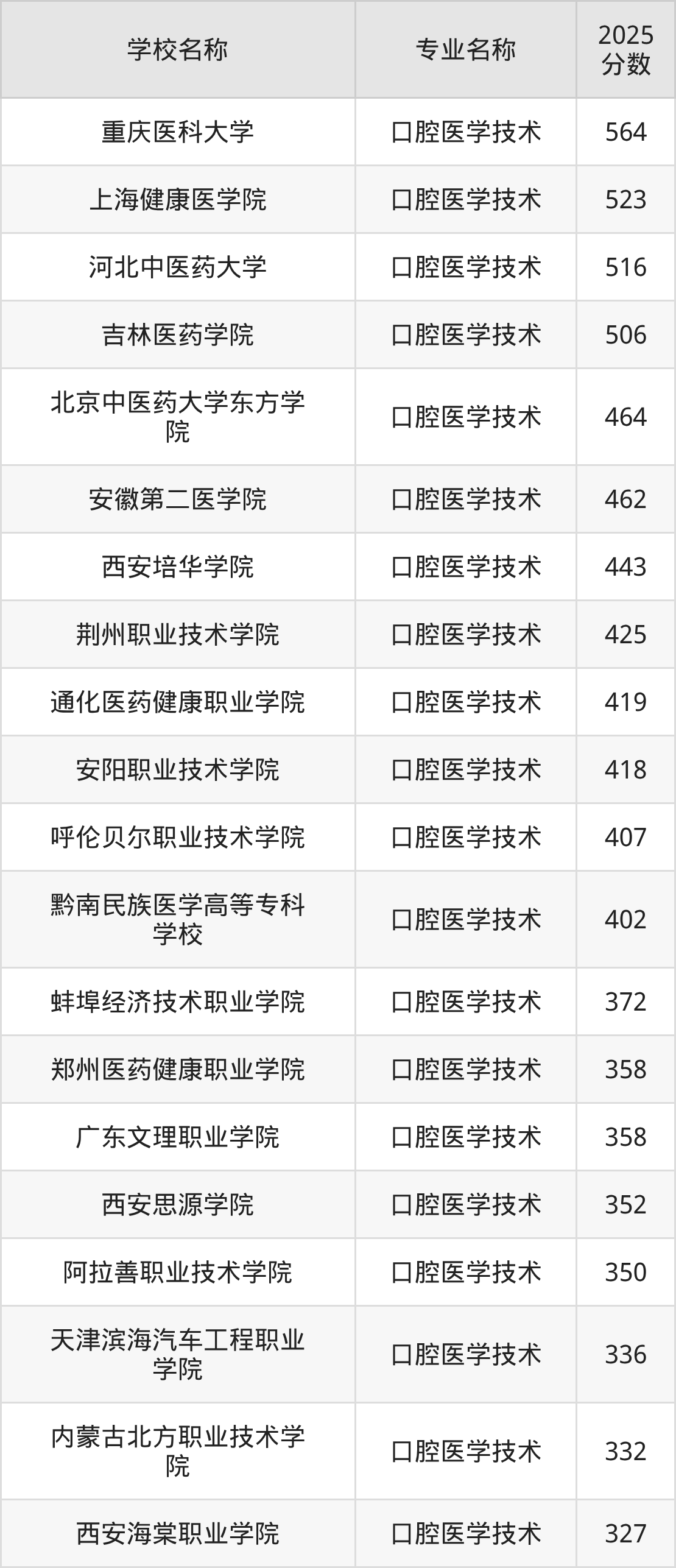 | 烟台卫生健康职业学院 | 口腔医学技术 | 379 |