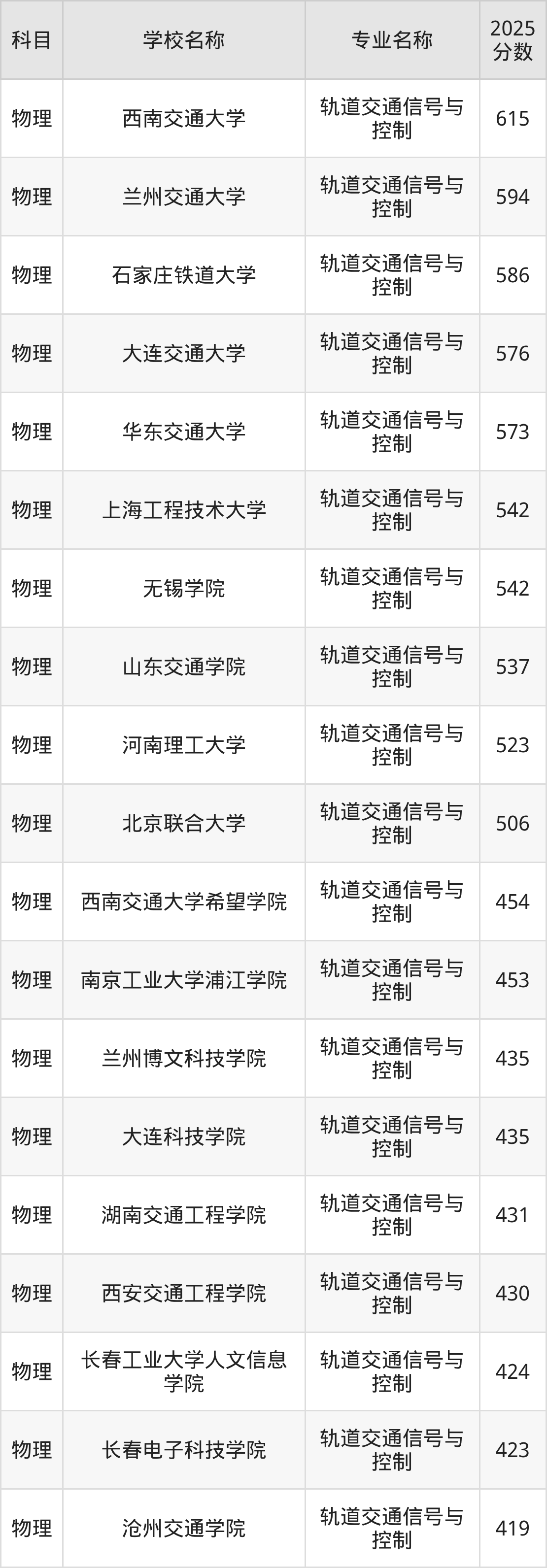 通过上文大家可以知晓,在山西省内招轨道交通信号与控制专业的院校数量较少,所以下文将为2026届高考生继续展示:省外大学的轨道交通信号与控制专业2025年在山西高考的录取情况,包含西南交通大学、兰州交通大学、石家庄铁道大学、大连交通大学、华东交通大学。
