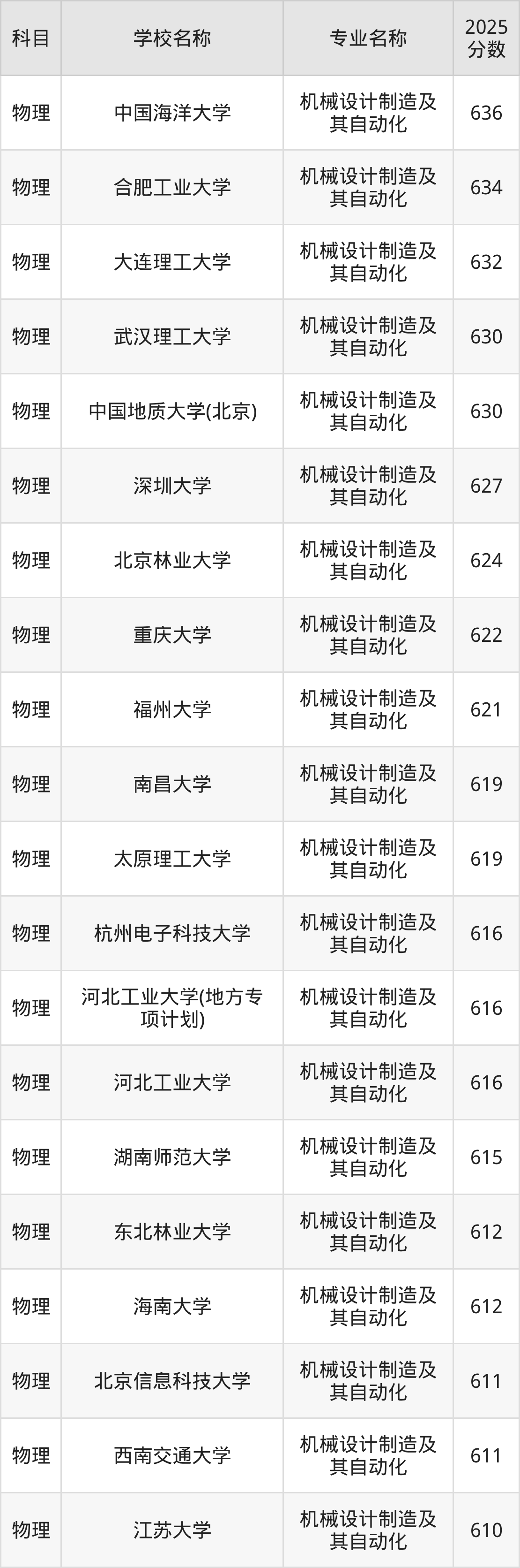 通过上文大家可以知晓,在河北省内招机械设计制造及其自动化专业的院校数量较少,所以下文将为2026届高考生继续展示:省外大学的机械设计制造及其自动化专业2025年在河北高考的录取情况,包含中国海洋大学、合肥工业大学、大连理工大学、武汉理工大学、中国地质大学(北京)。