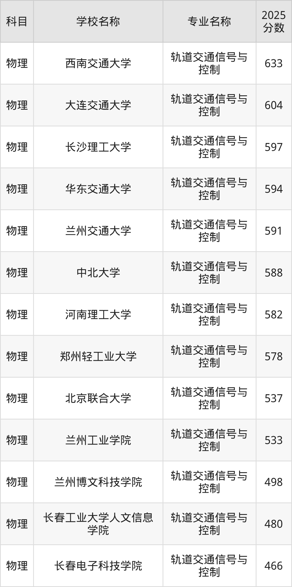通过上文大家可以知晓,在河北省内招轨道交通信号与控制专业的院校数量较少,所以下文将为2026届高考生继续展示:省外大学的轨道交通信号与控制专业2025年在河北高考的录取情况,包含西南交通大学、大连交通大学、长沙理工大学、华东交通大学、兰州交通大学。