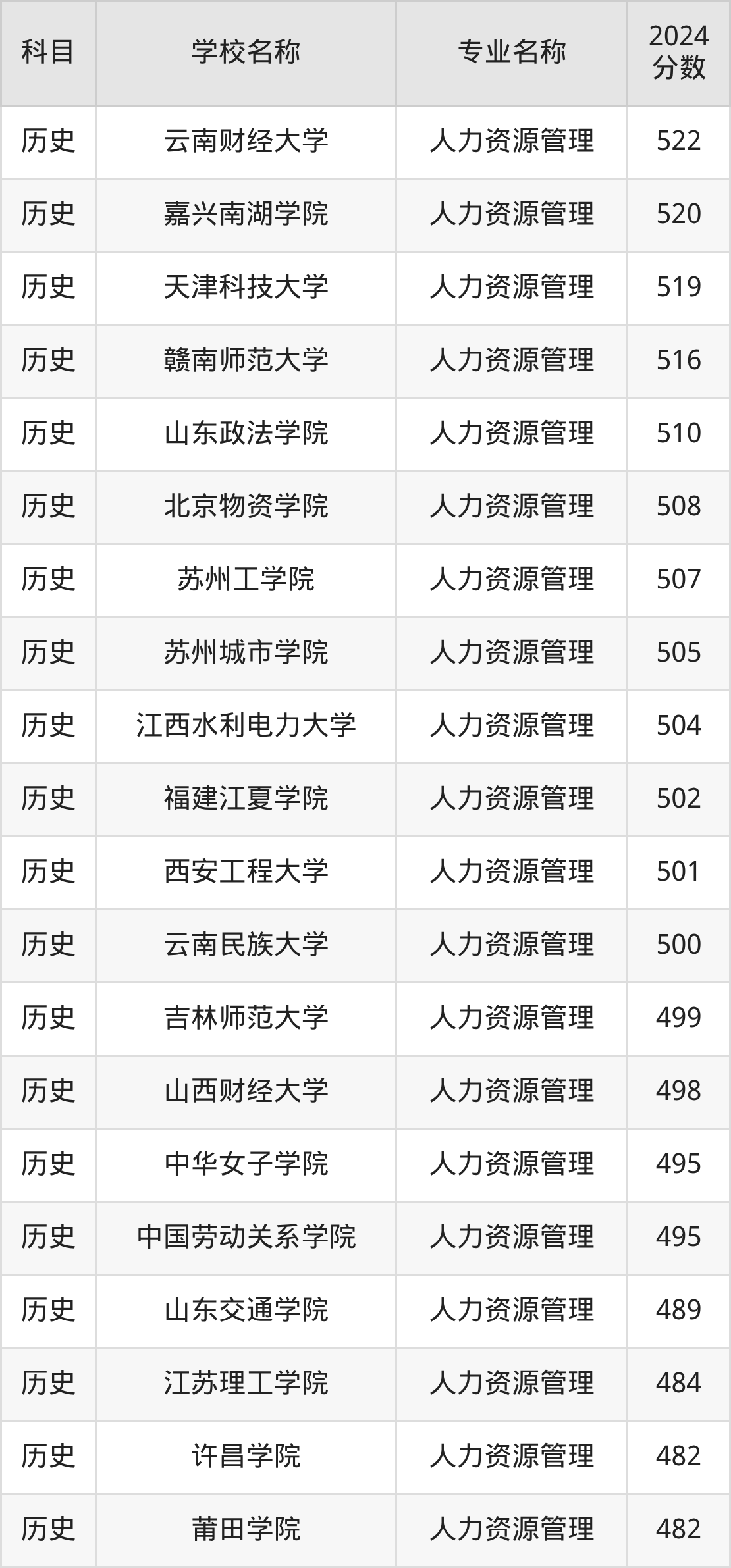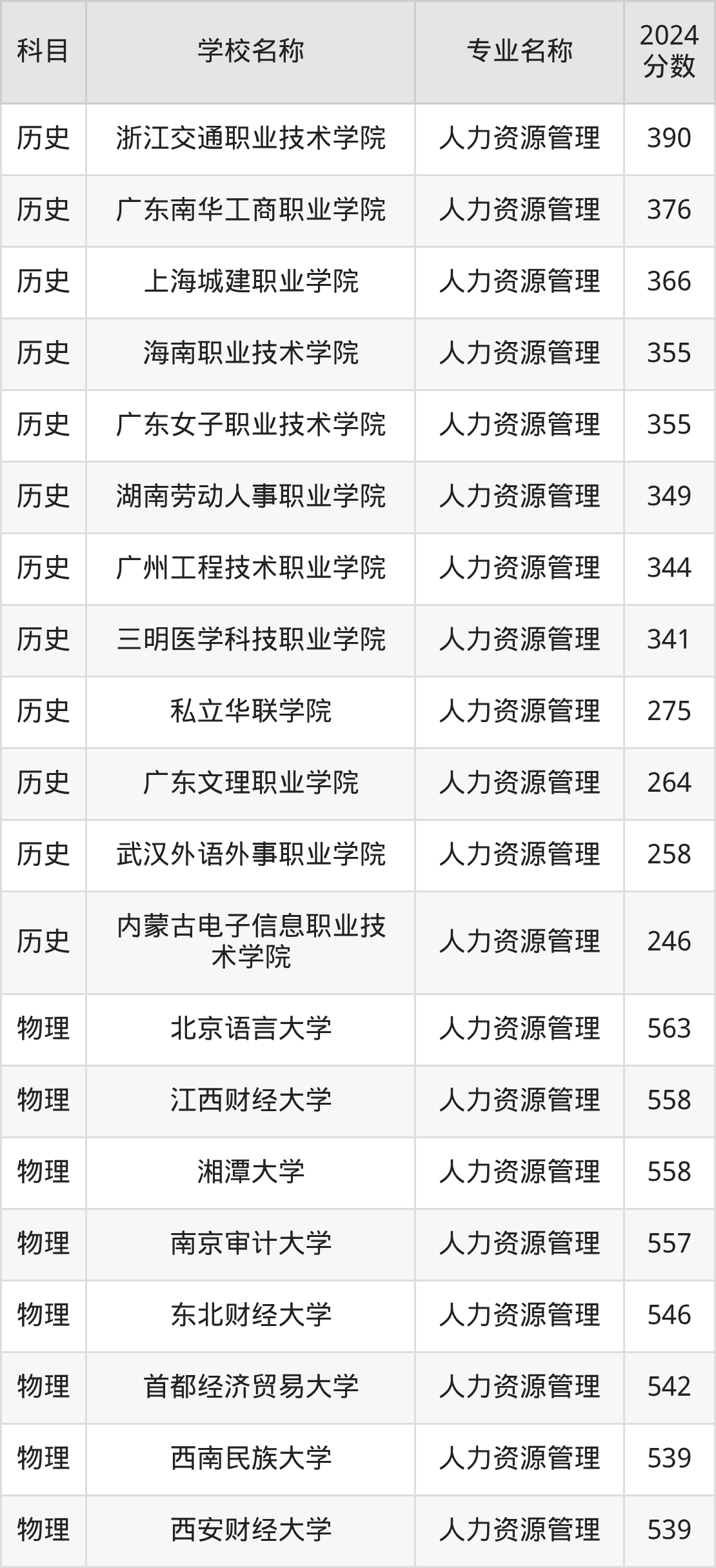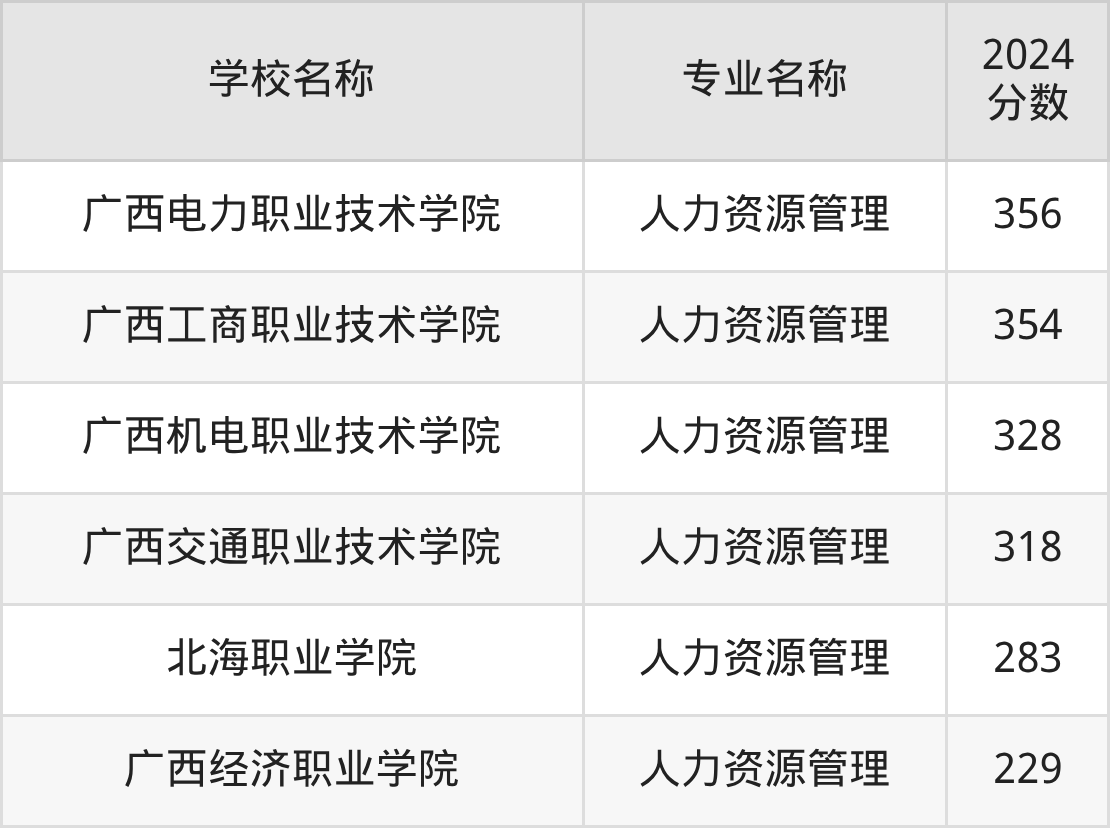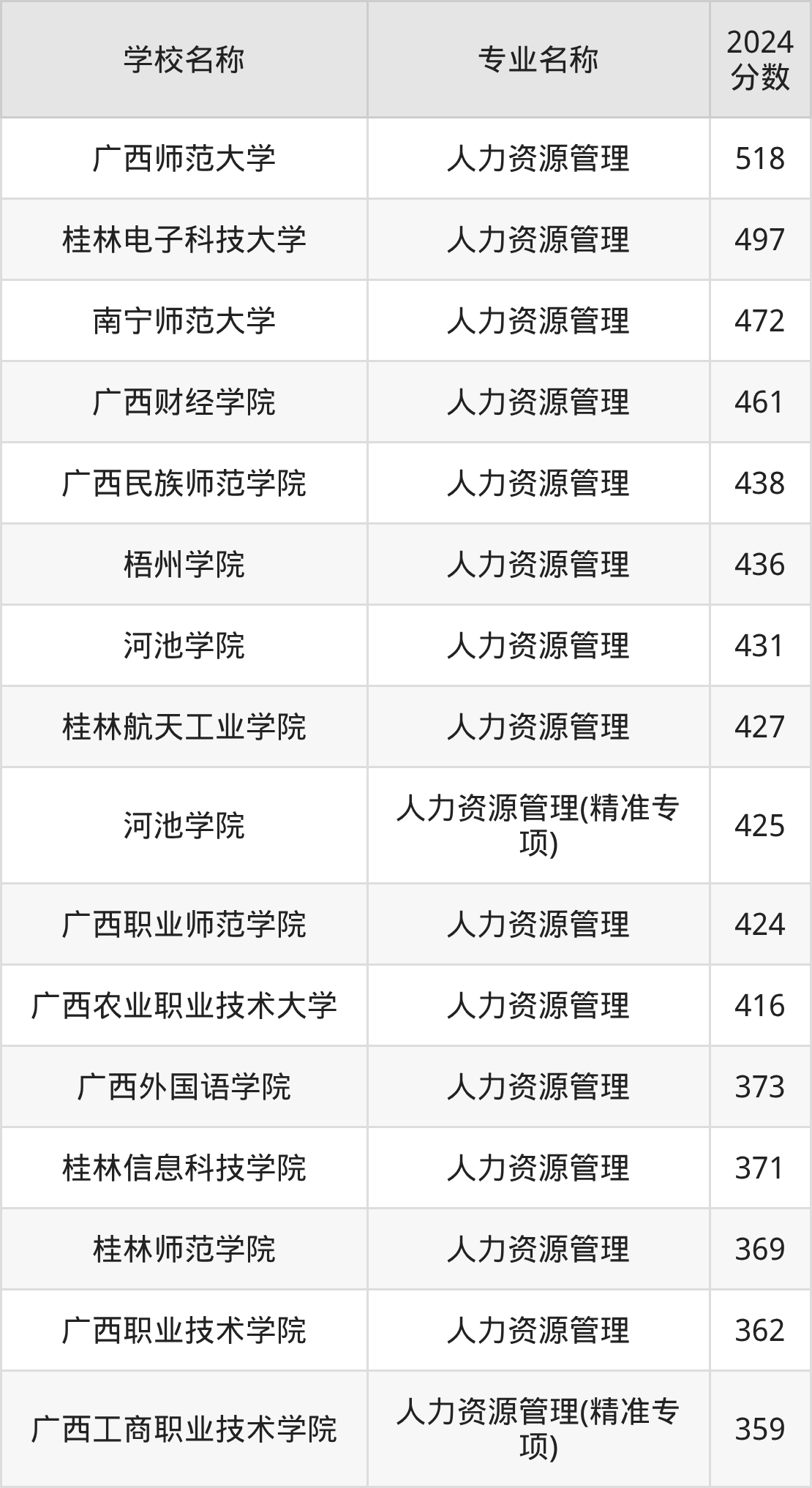 下文将为大家展示广西壮族自治区大学人力资源管理专业2024年在广西高考的最低录取分数线!