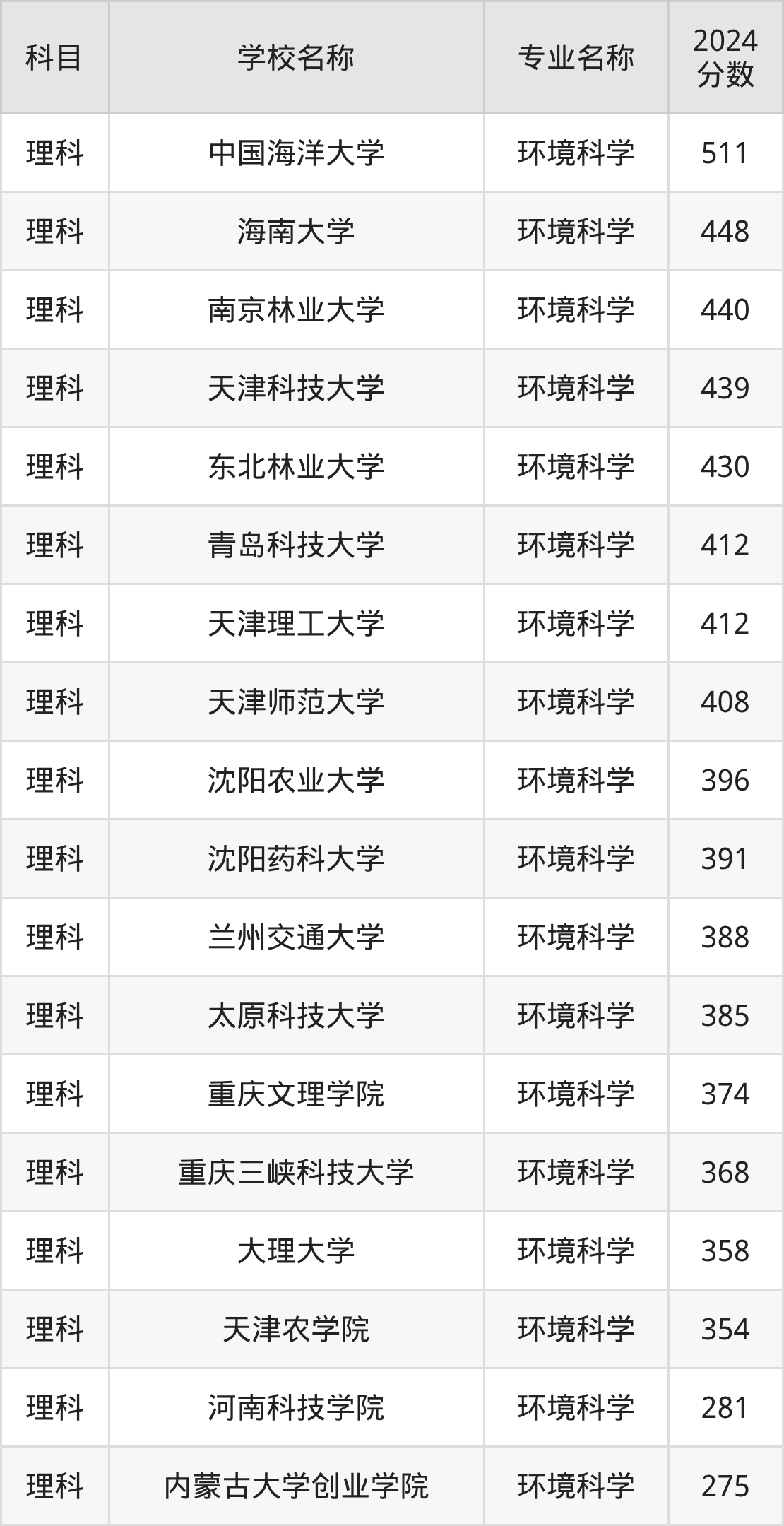 通过上文大家可以知晓,在新疆维吾尔自治区内招环境科学专业的院校数量较少,所以下文将为2026届高考生继续展示:维吾尔自治区外大学的环境科学专业2024年在新疆高考的录取情况,包含中国海洋大学、海南大学、南京林业大学、天津科技大学、东北林业大学。