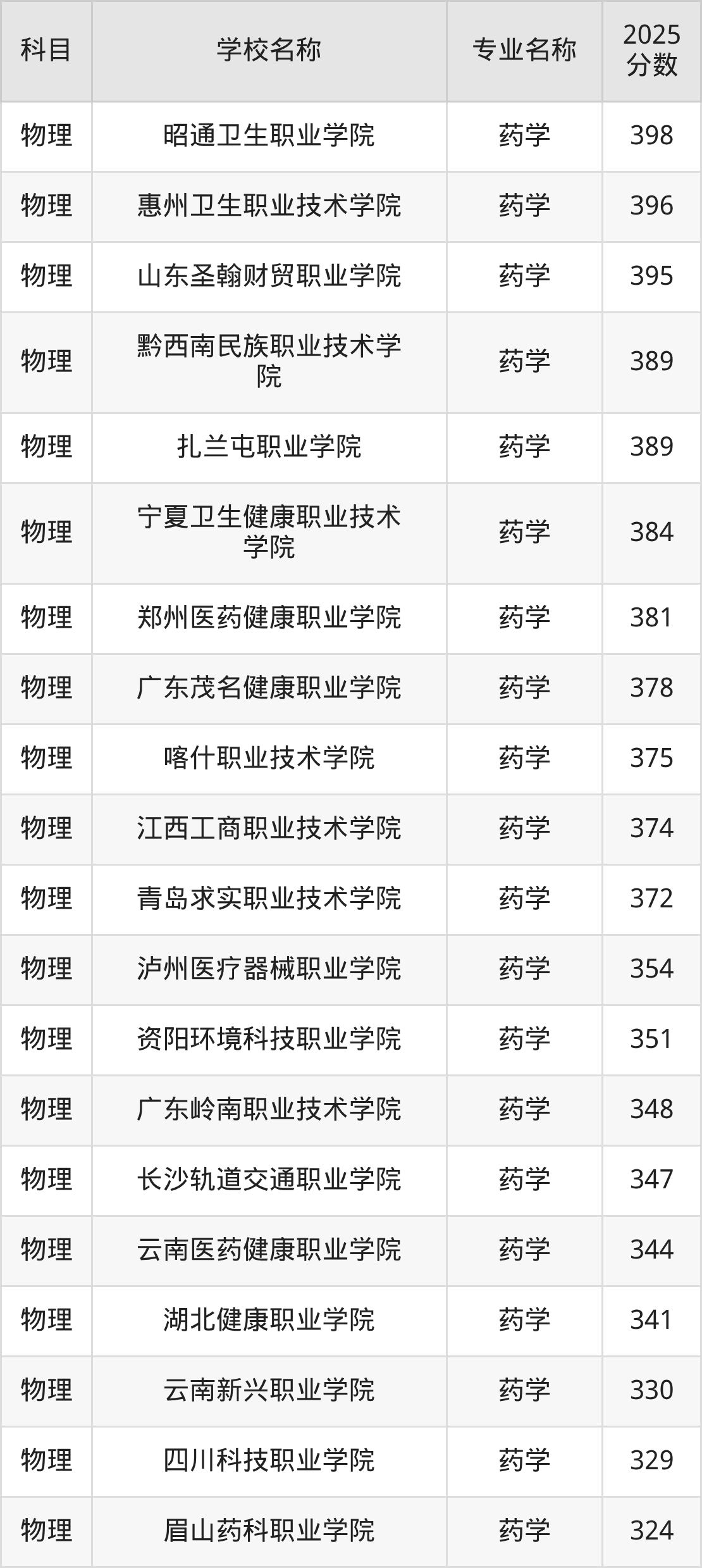 | 石家庄人民医学高等专 科学校 | 药学 | 333 |