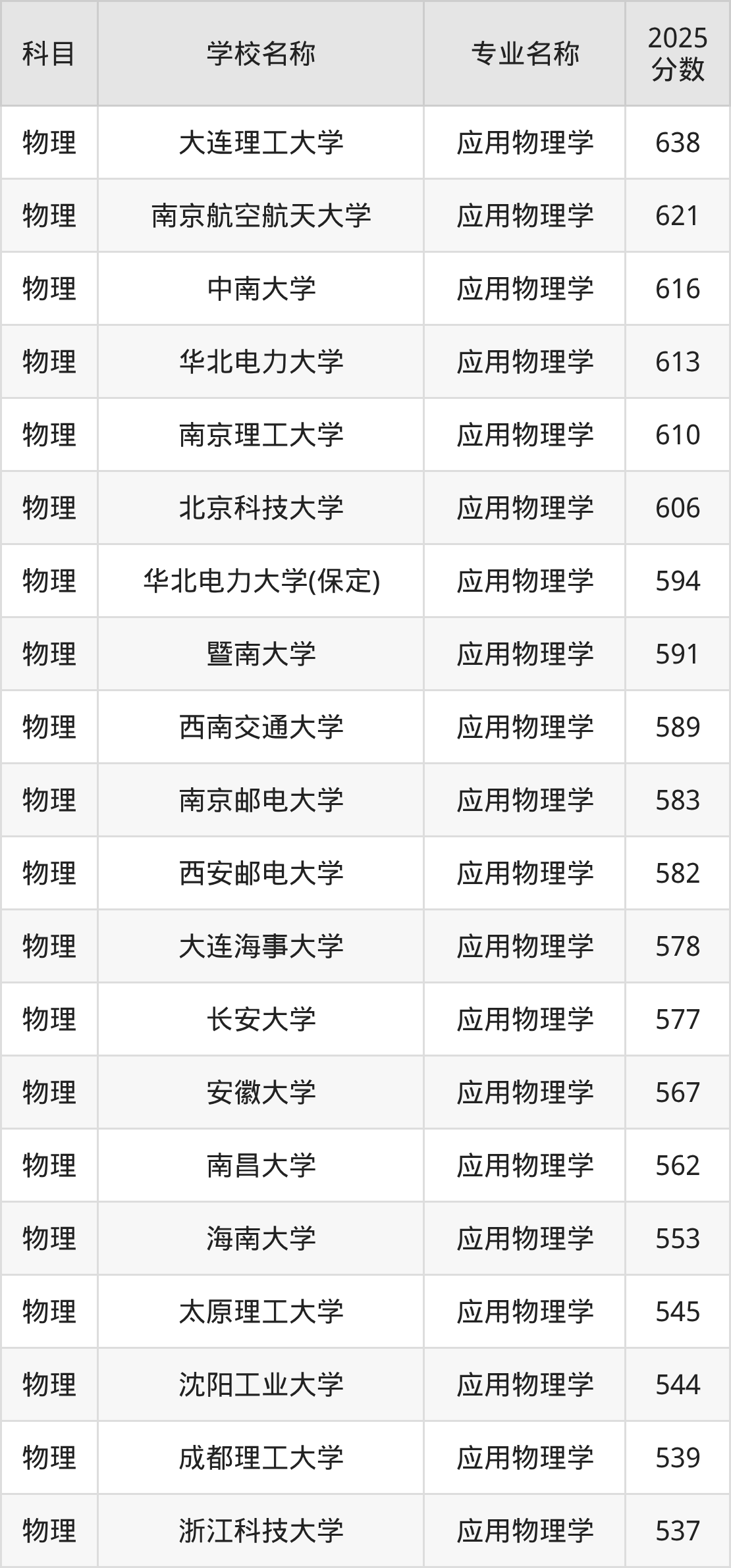 通过上文大家可以知晓,在吉林省内招应用物理学专业的院校数量较少,所以下文将为2026届高考生继续展示:省外大学的应用物理学专业2025年在吉林高考的录取情况,包含大连理工大学、南京航空航天大学、中南大学、华北电力大学、南京理工大学。