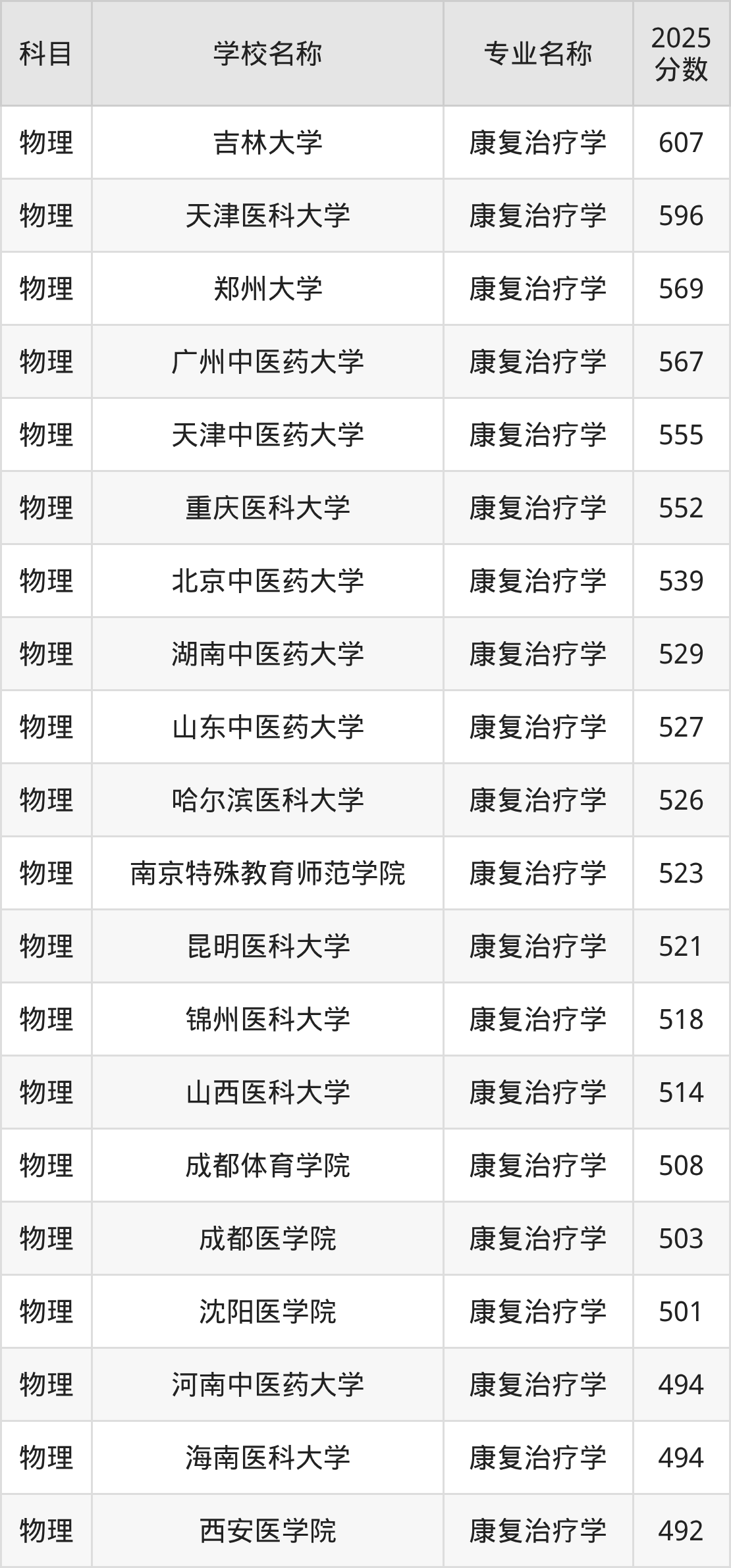 通过上文大家可以知晓,在内蒙古自治区内招康复治疗学专业的院校数量较少,所以下文将为2026届高考生继续展示:自治区外大学的康复治疗学专业2025年在内蒙古高考的录取情况,包含吉林大学、天津医科大学、郑州大学、广州中医药大学、天津中医药大学。