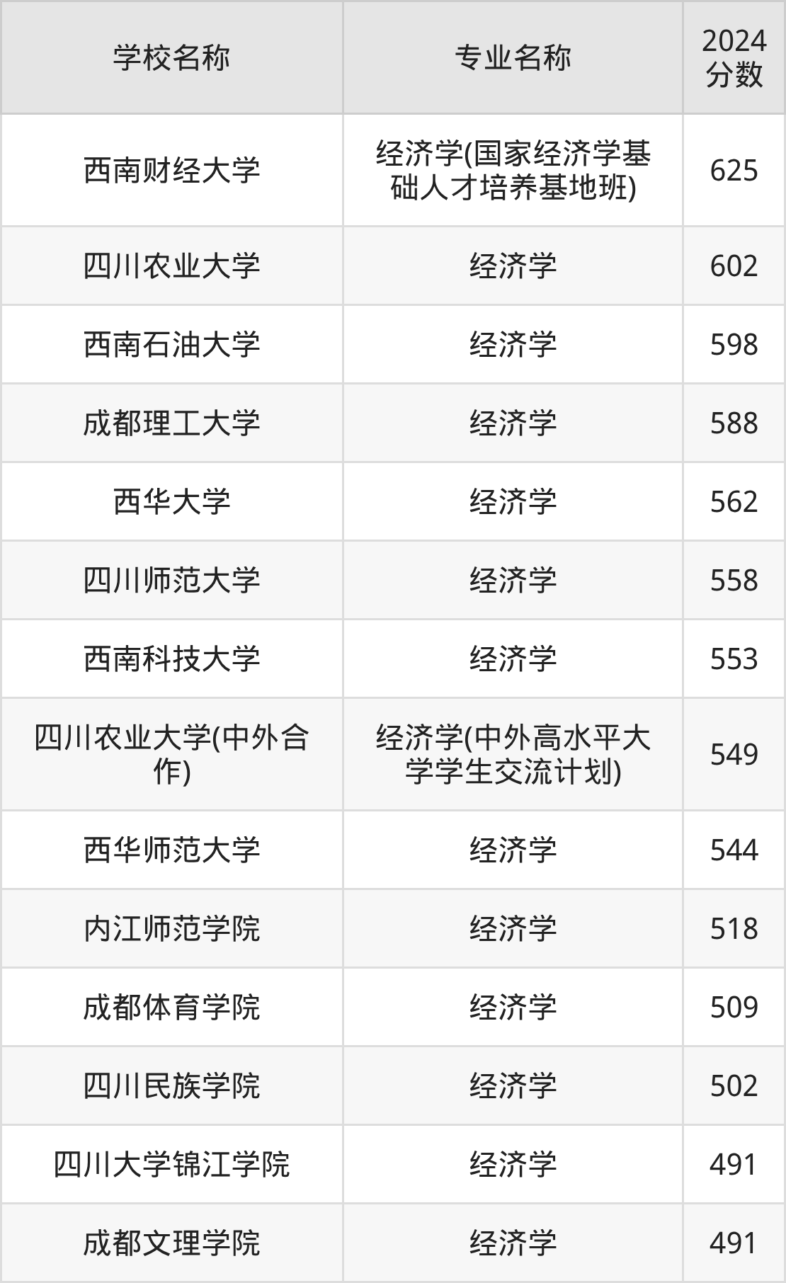 圆梦小编根据四川2024年高考文科专业分,将开设了经济学专业且位于四川省内的大学按照“录取分”从高到低排序,得出了以上榜单。