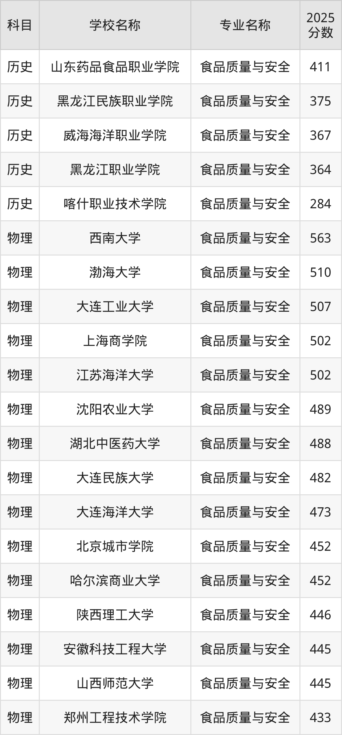 通过上文大家可以知晓,在吉林省内招食品质量与安全专业的院校数量较少,所以下文将为2026届高考生继续展示:省外大学的食品质量与安全专业2025年在吉林高考的录取情况,包含山东药品食品职业学院、黑龙江民族职业学院、威海海洋职业学院、黑龙江职业学院、喀什职业技术学院。