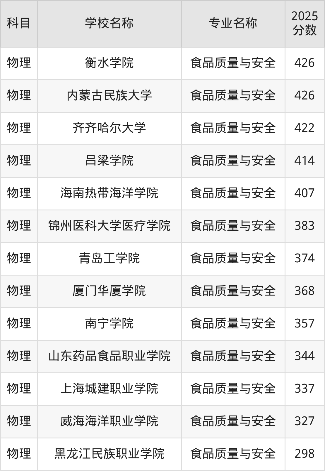 圆梦小编根据吉林2025年高考物理组专业分,将开设了食品质量与安全专业且位于吉林省内的大学按照“录取分”从高到低排序,得出了以上榜单。