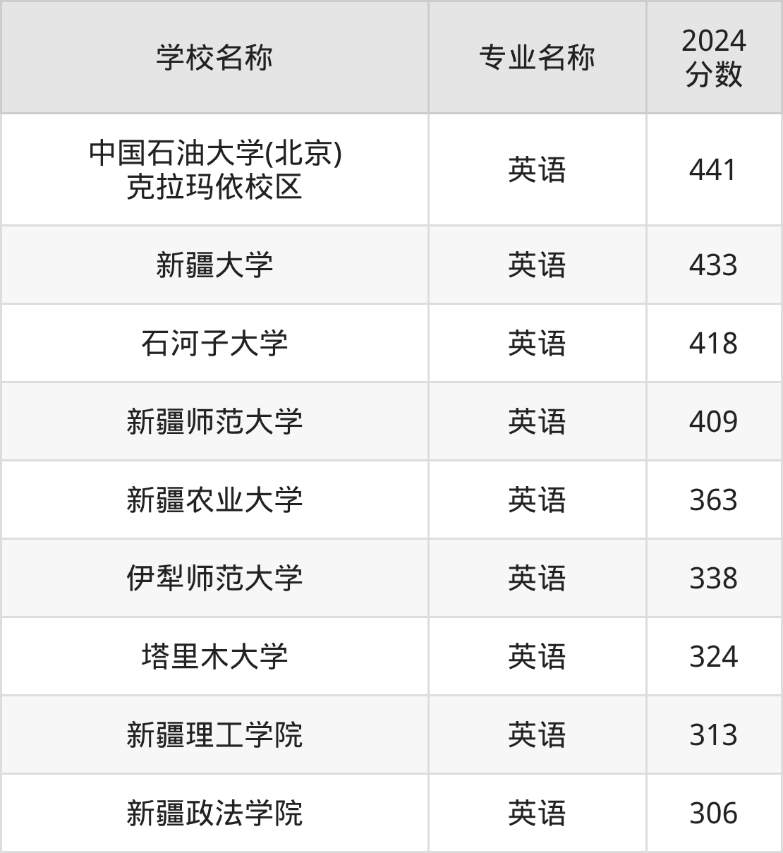 在直接以“英语”的名称招生的新疆维吾尔自治区大学中,中国石油大学(北京)克拉玛依校区的分数线最高、排名第一名,在文科的最低分是470分,全维吾尔自治区排名前2152位的高考生才有较大机会被录取。